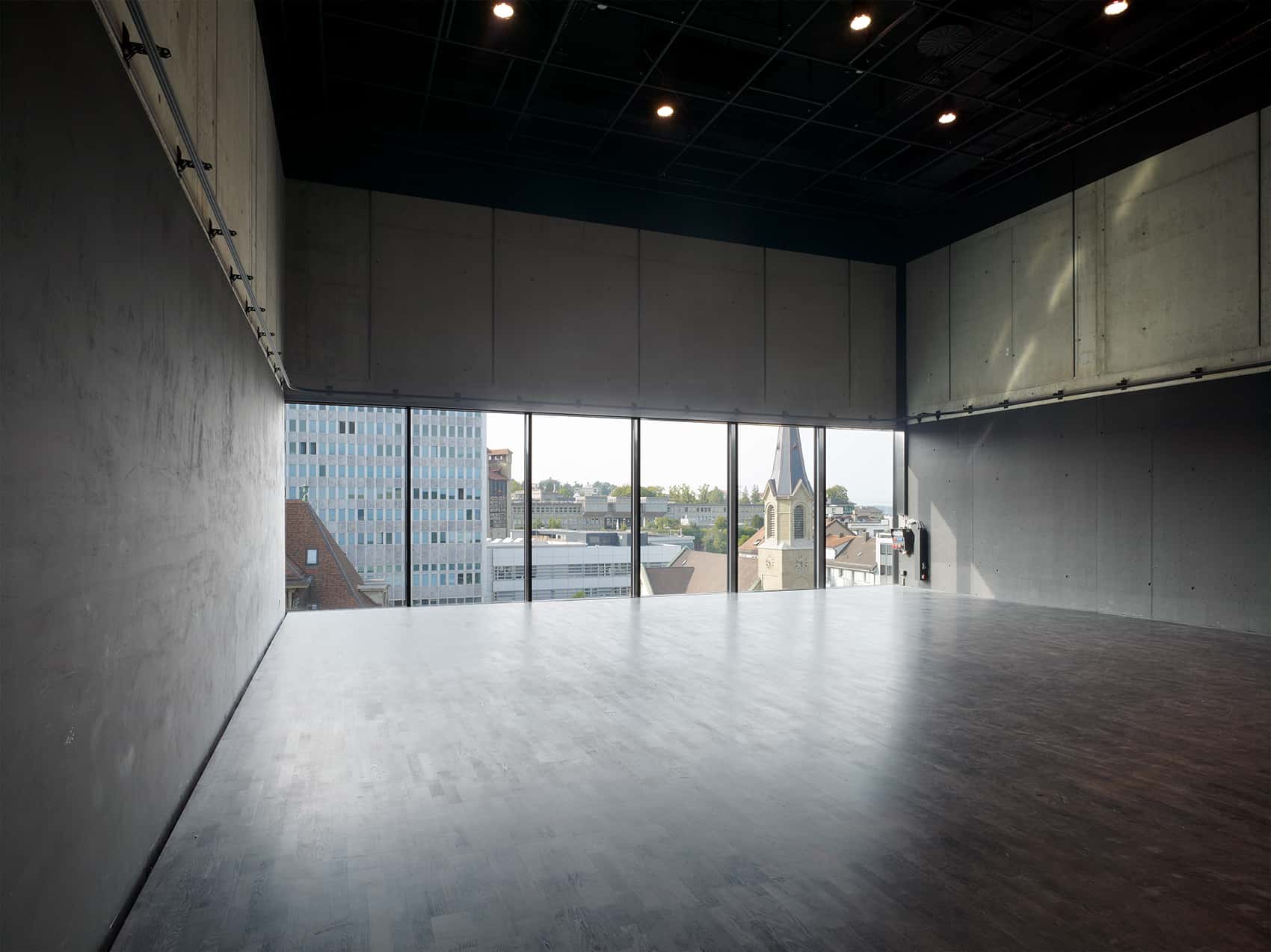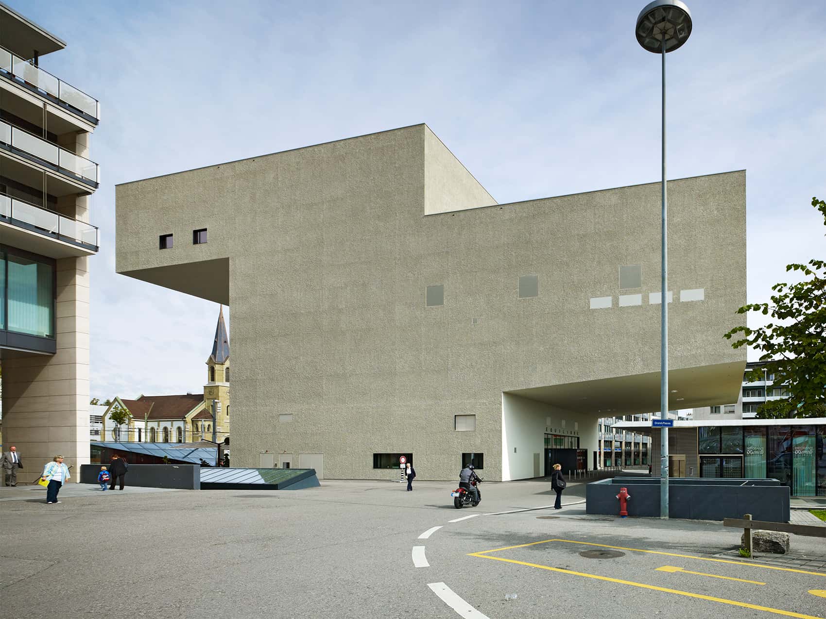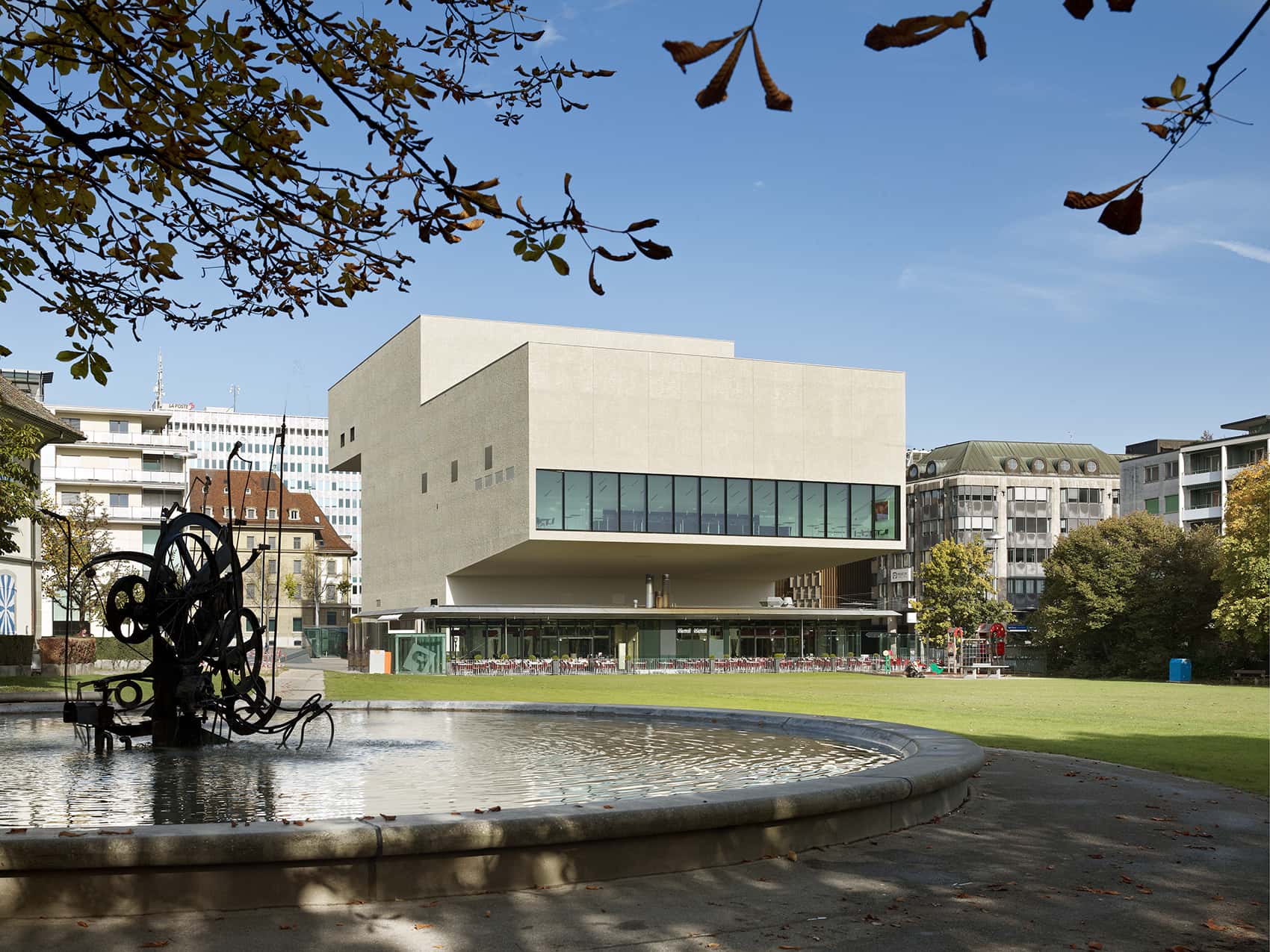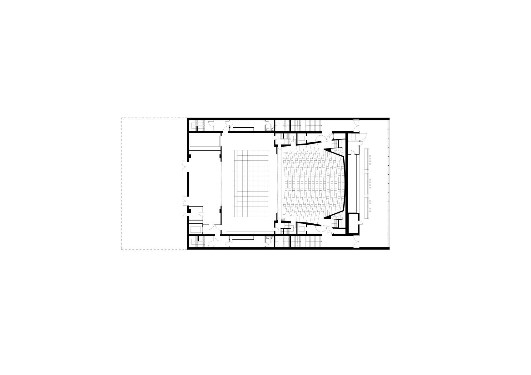 Die minimale Standfläche des Neubaus erlaubt die Maximierung des städtisch-öffentlichen Aussenraumes. Auf unterschiedlichen Höhen kragen stadtseitig der Übungssaal und die Administration, parkseitig das Auditorium und die Bar aus. Das Foyer des Theaters und das Büro für Touristeninformation befinden sich im öffentlichen Erdgeschoss.
