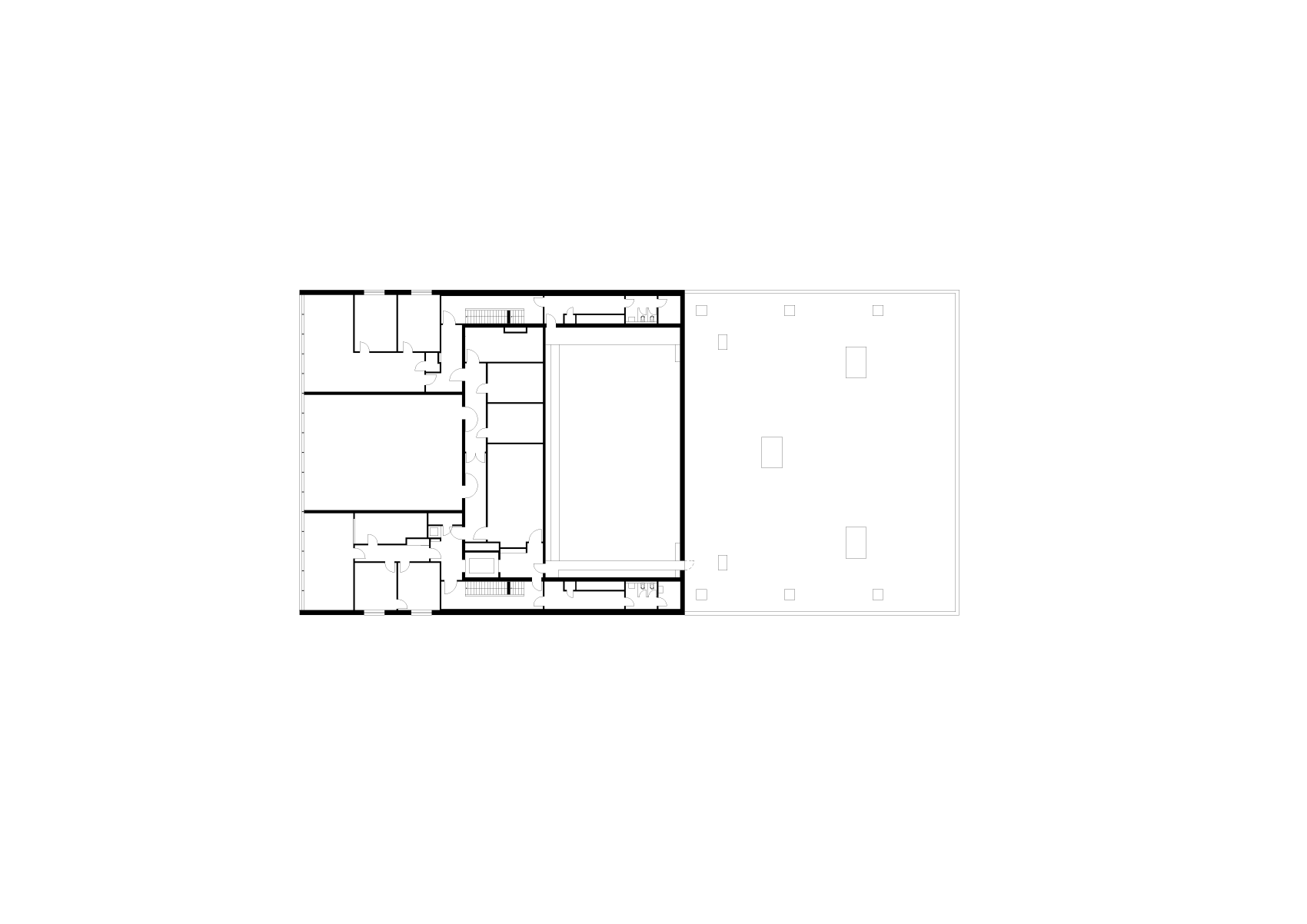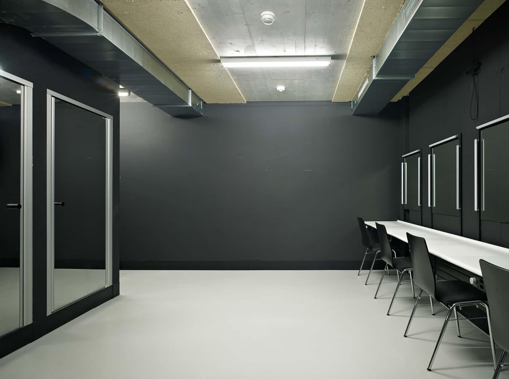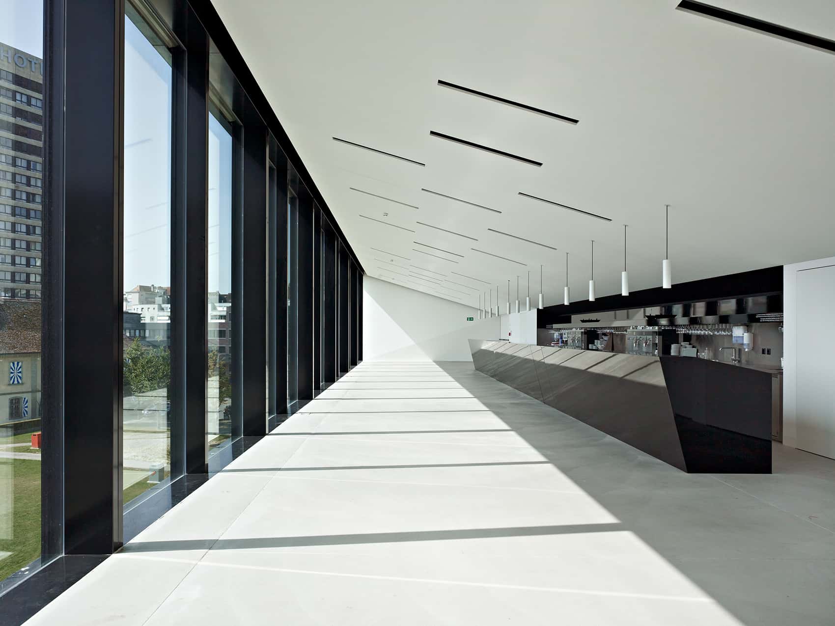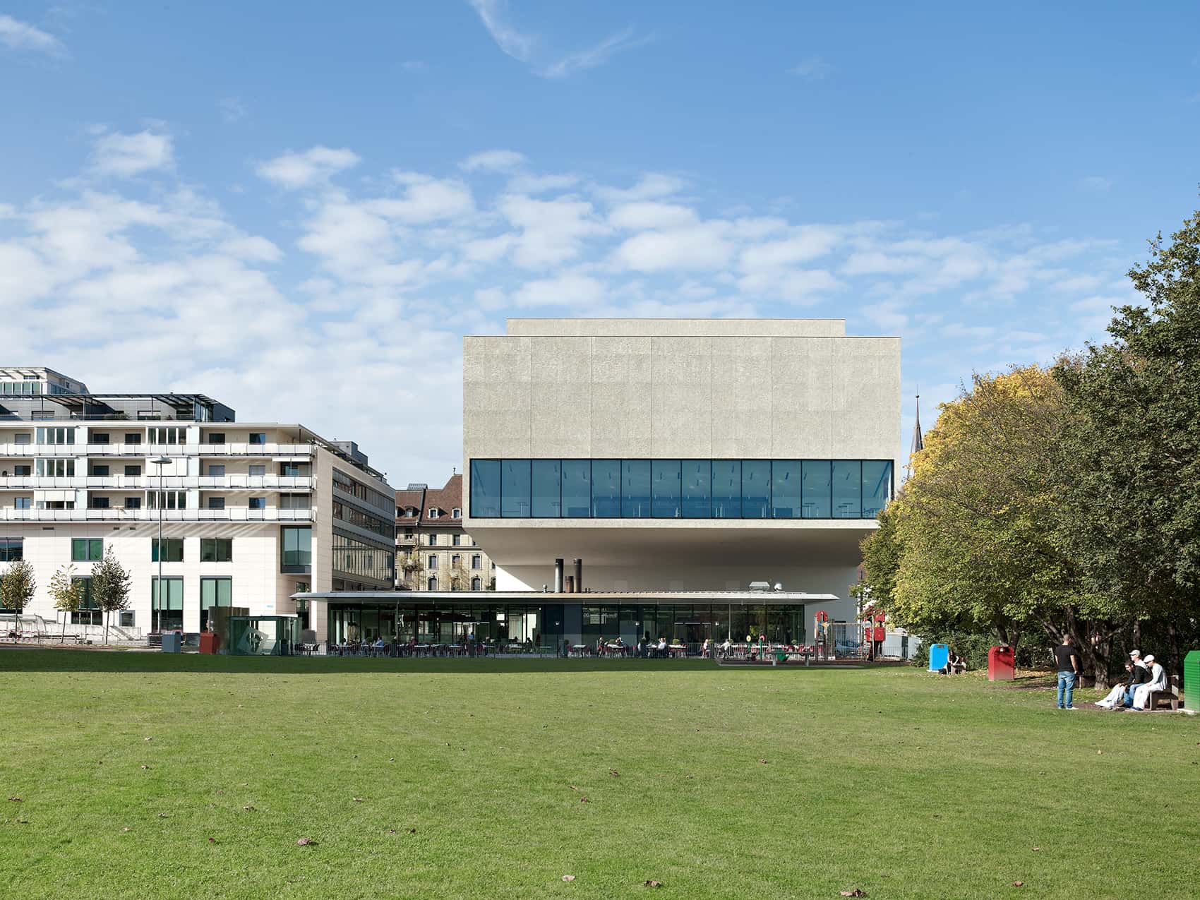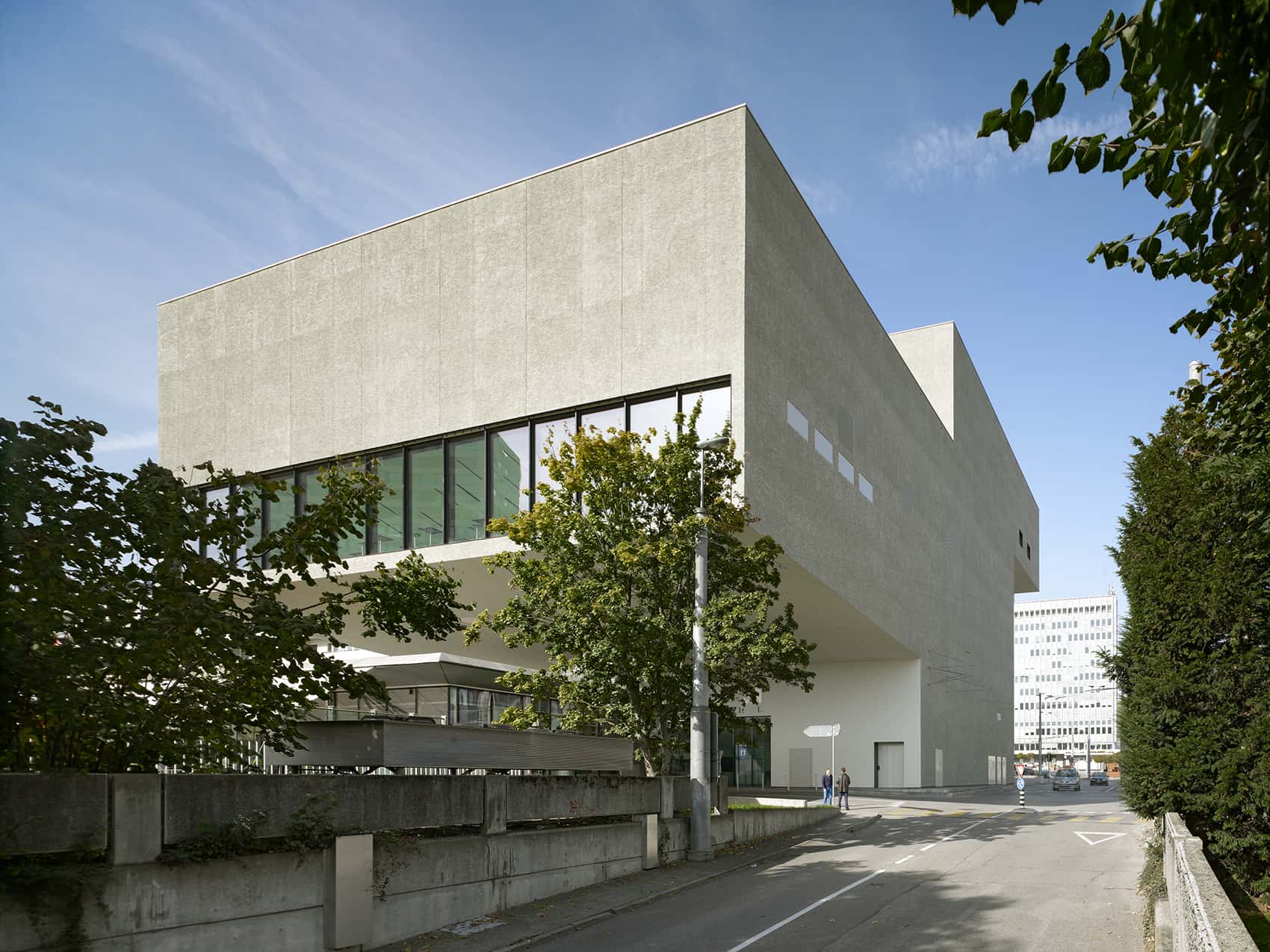 Die minimale Standfläche des Neubaus erlaubt die Maximierung des städtisch-öffentlichen Aussenraumes. Auf unterschiedlichen Höhen kragen stadtseitig der Übungssaal und die Administration, parkseitig das Auditorium und die Bar aus. Das Foyer des Theaters und das Büro für Touristeninformation befinden sich im öffentlichen Erdgeschoss.