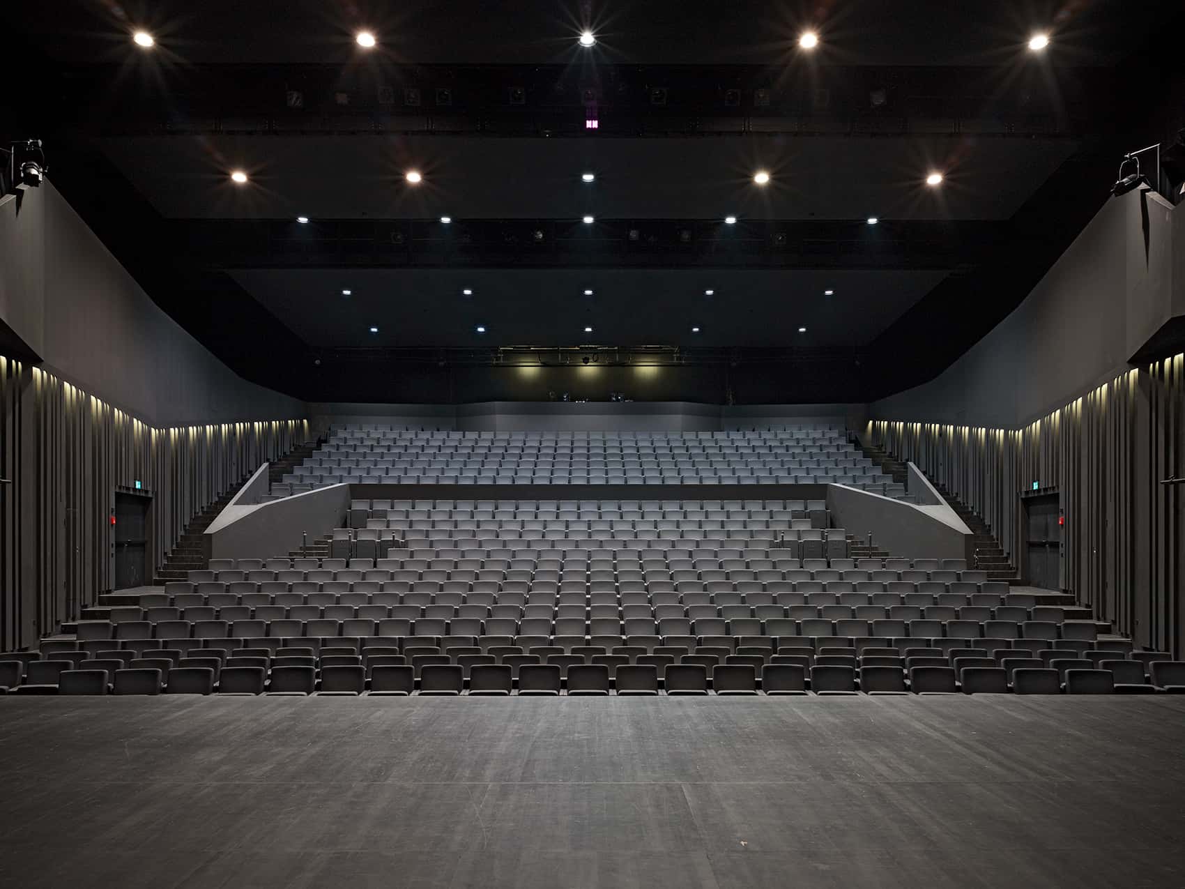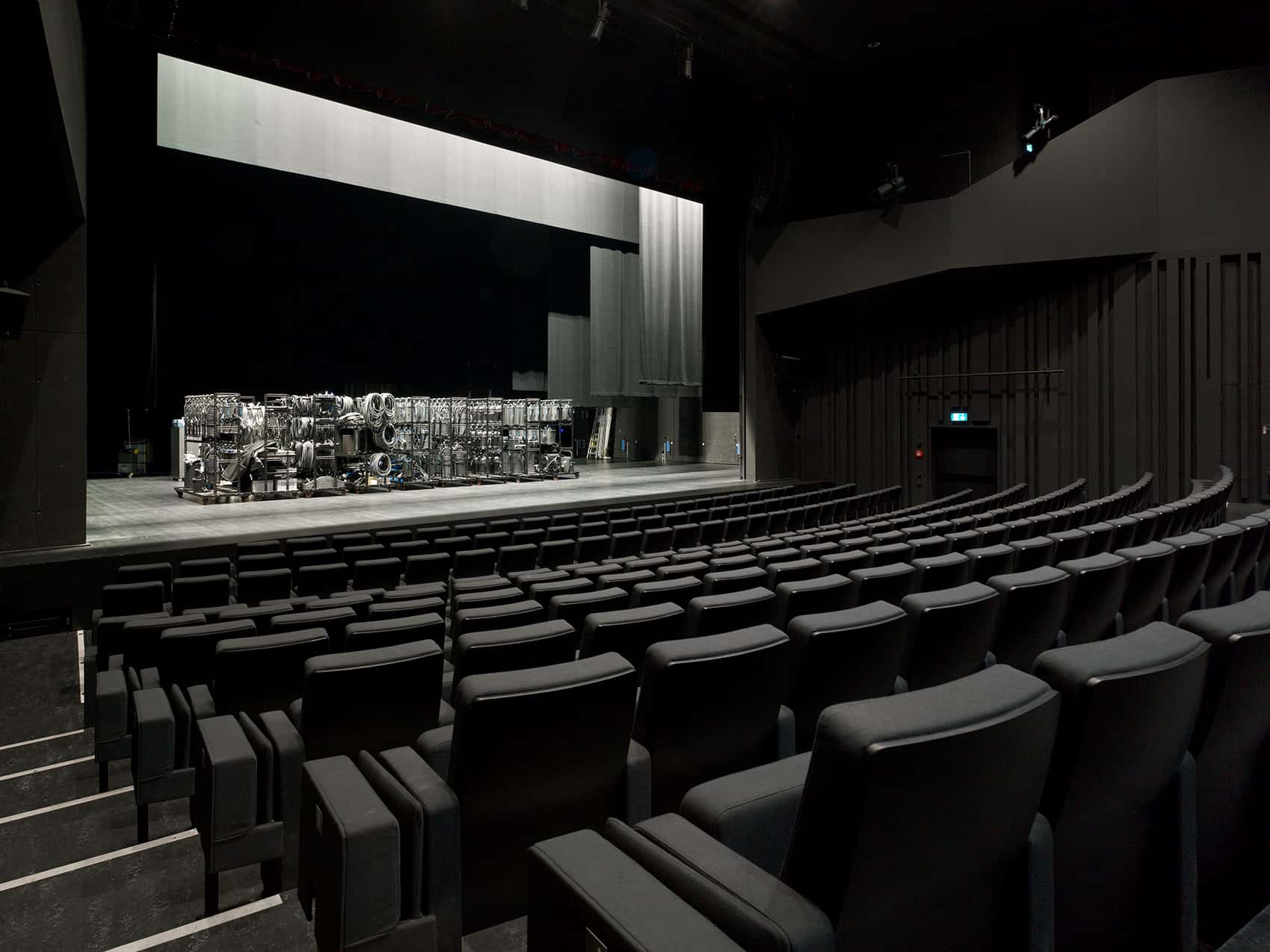 Die Auskragungen werden durch zwei vom Bühnenturm abgehängte, seitlich ausgesteifte Tragrahmen in Stahlbeton erstellt. Darin werden zudem die Erschliessung für Zuschauer und Mitarbeiter sowie die Gebäudetechnik geführt. Grosse Fachwerke überspannen in Querrichtung den Bühnenturm und das Auditorium.
