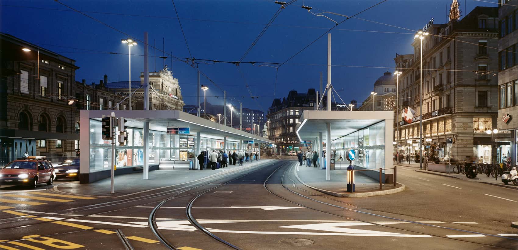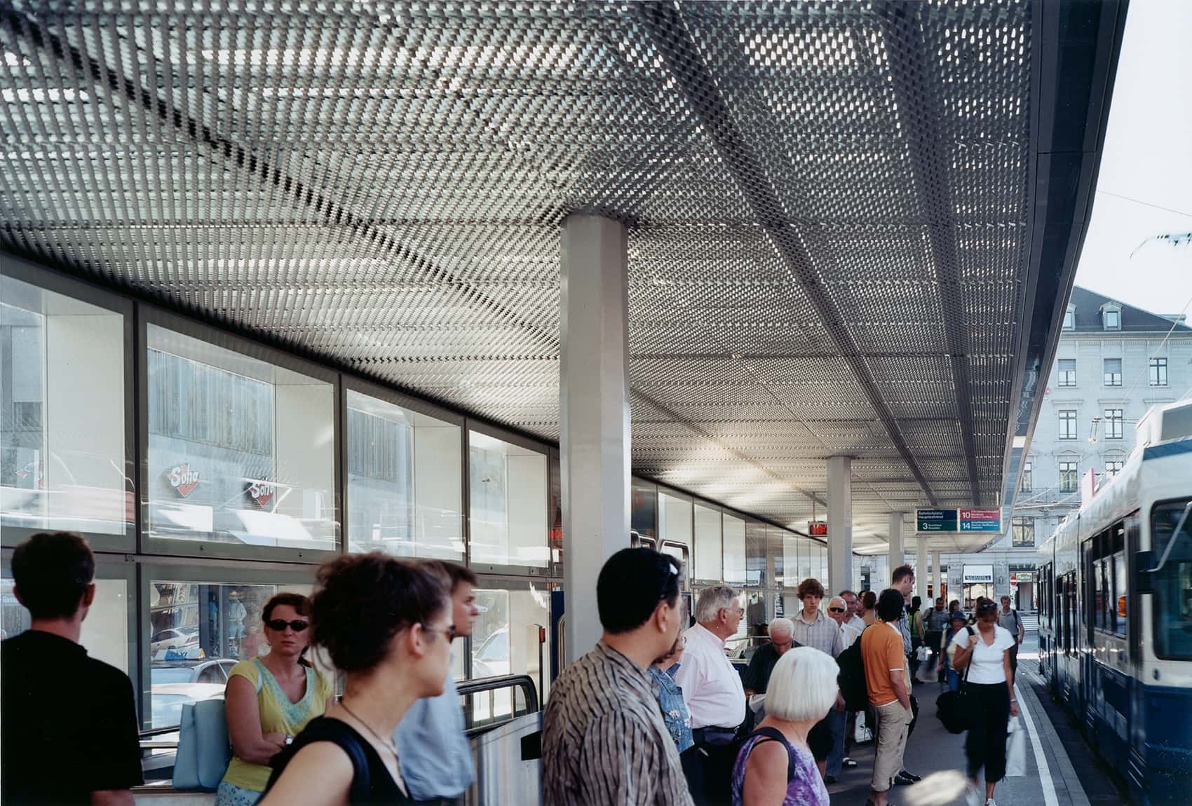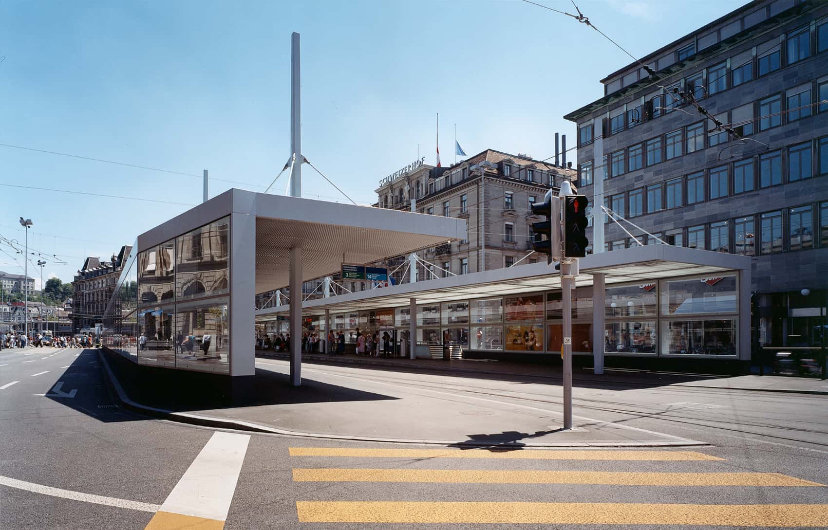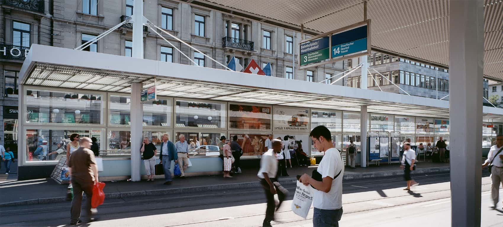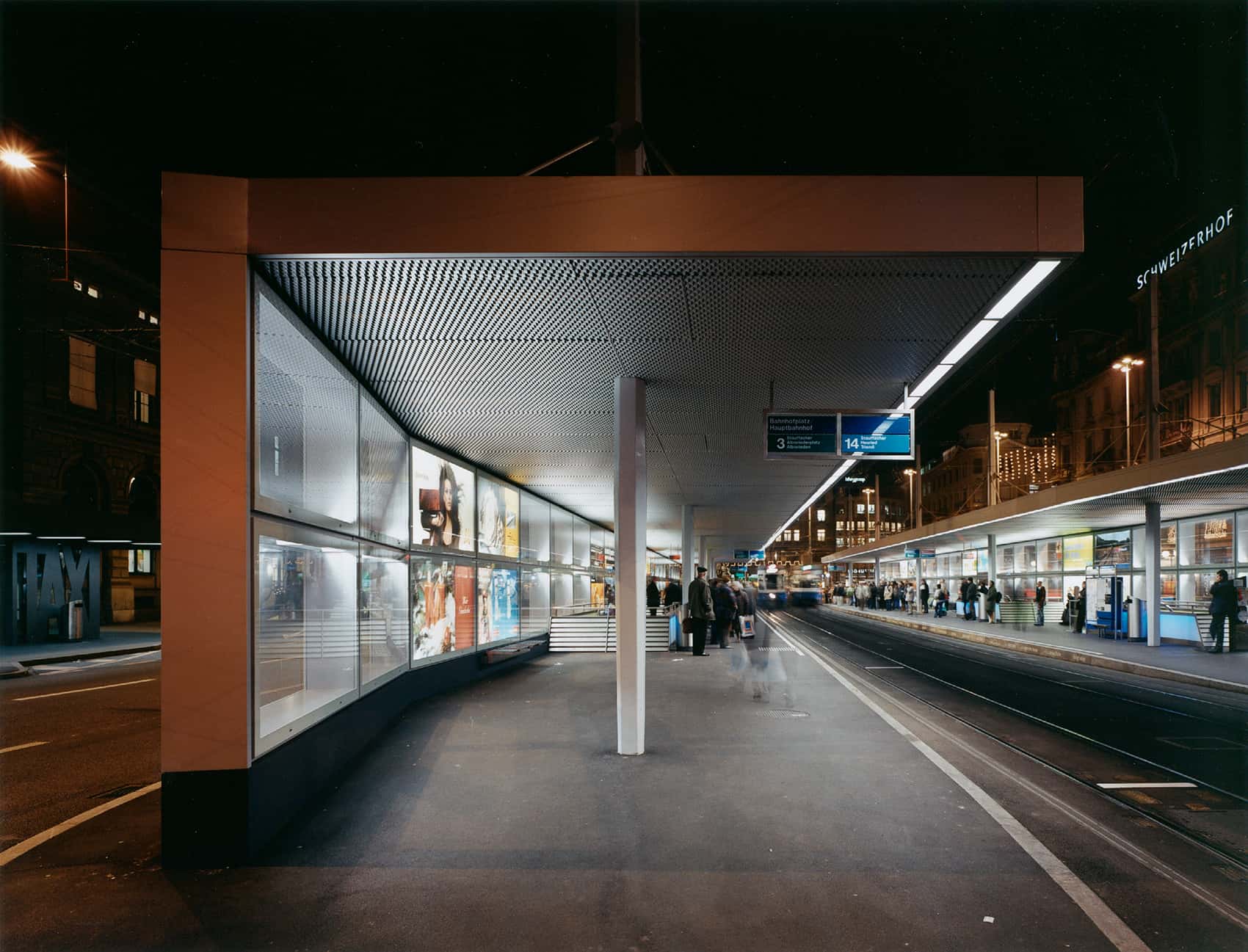 Die Tramwartehalle lässt sich in vier Teile differenzieren: Sockel, Wand, Dach und Pylone. In erster Linie dienen diese Elemente als Wetterschutz für die VBZ-Kundinnen und ‑Kunden. Die Rückwand schirmt ausserdem gegen den Lärm und Schmutz der vorbeifahrenden Autos und Busse ab. Die hinterleuchtete kastenförmige Rückwand wird punktuell mit Werbeplakaten bespielt.