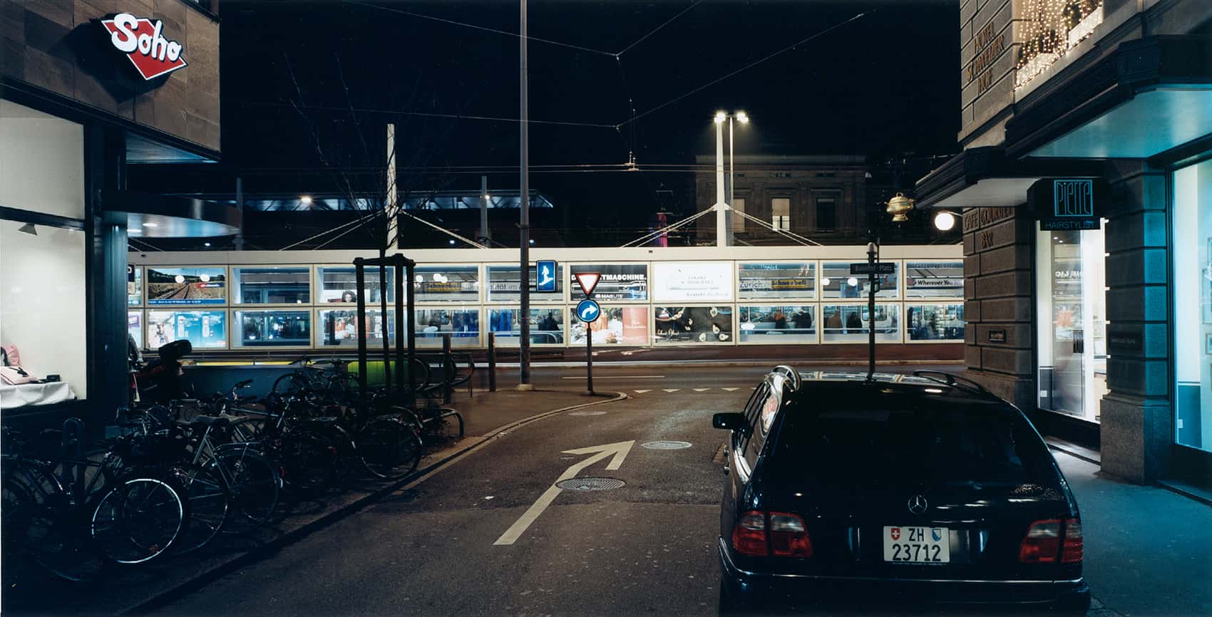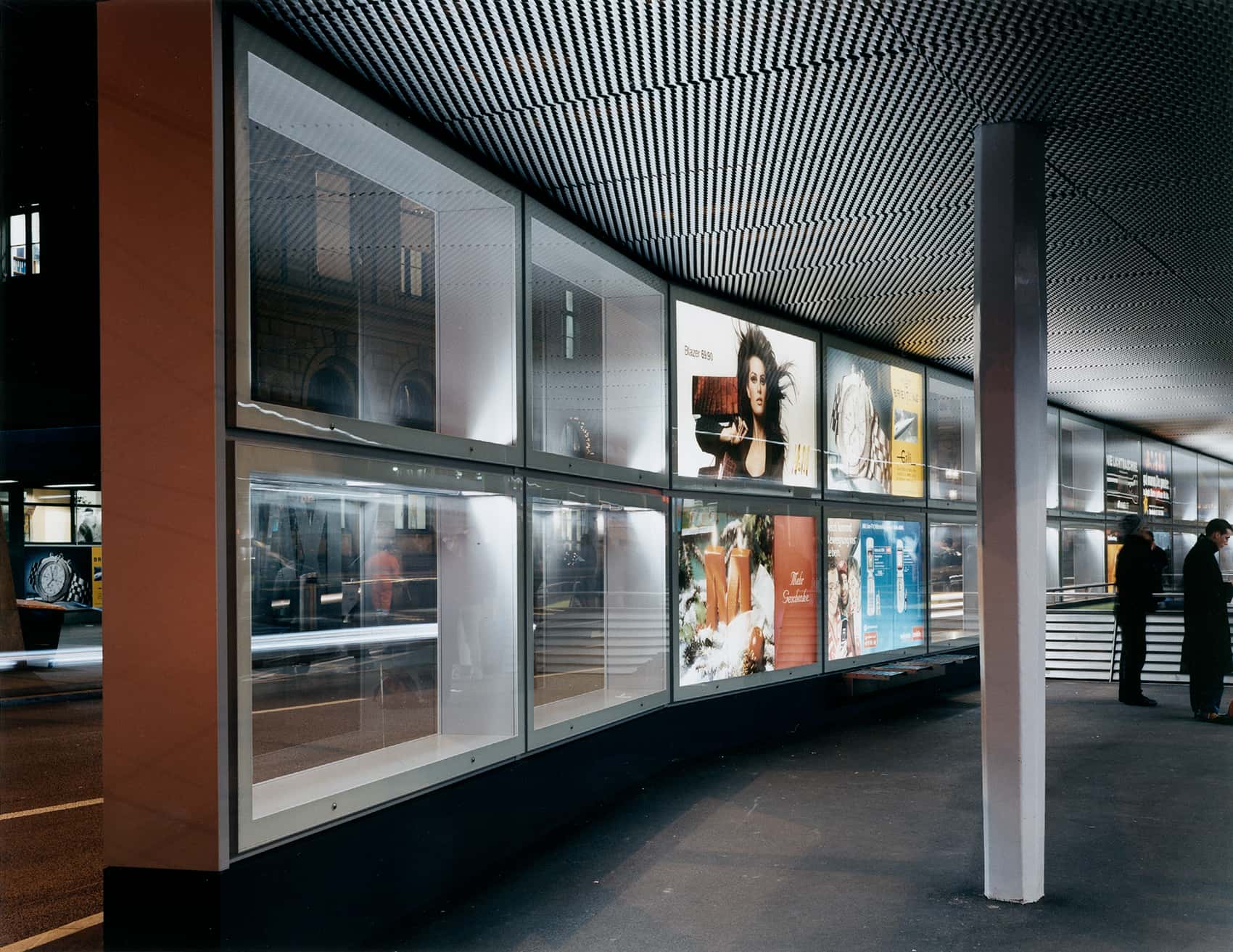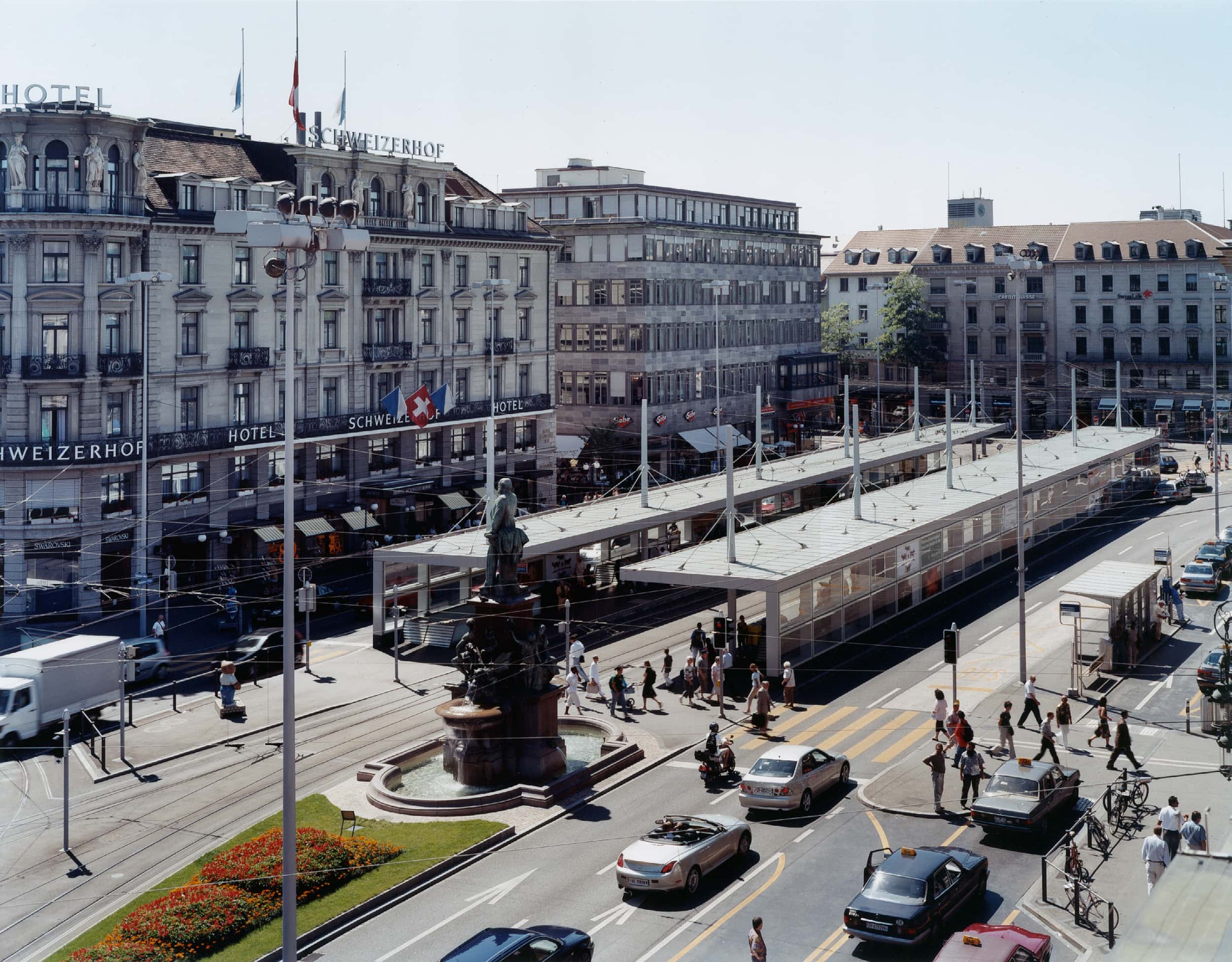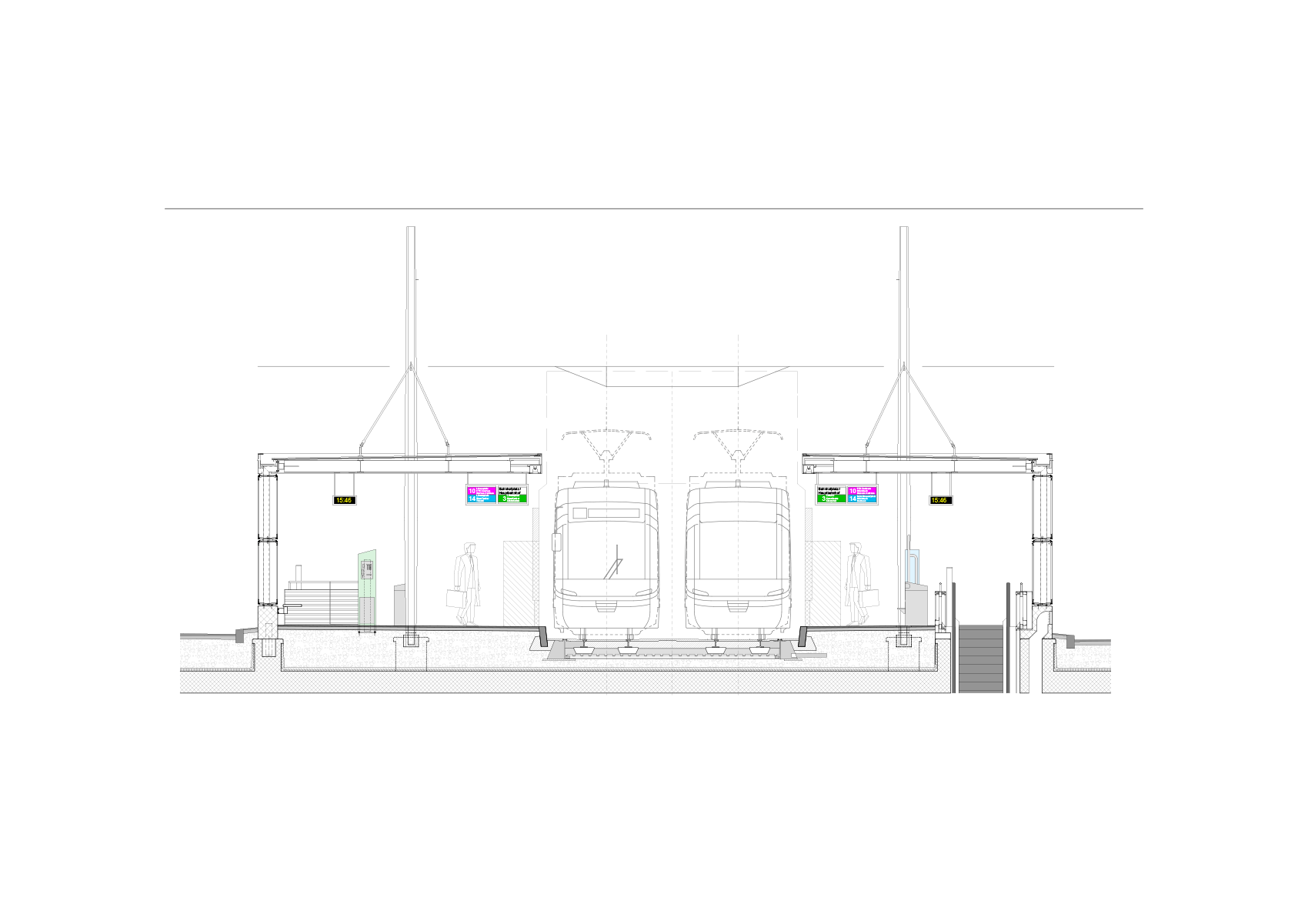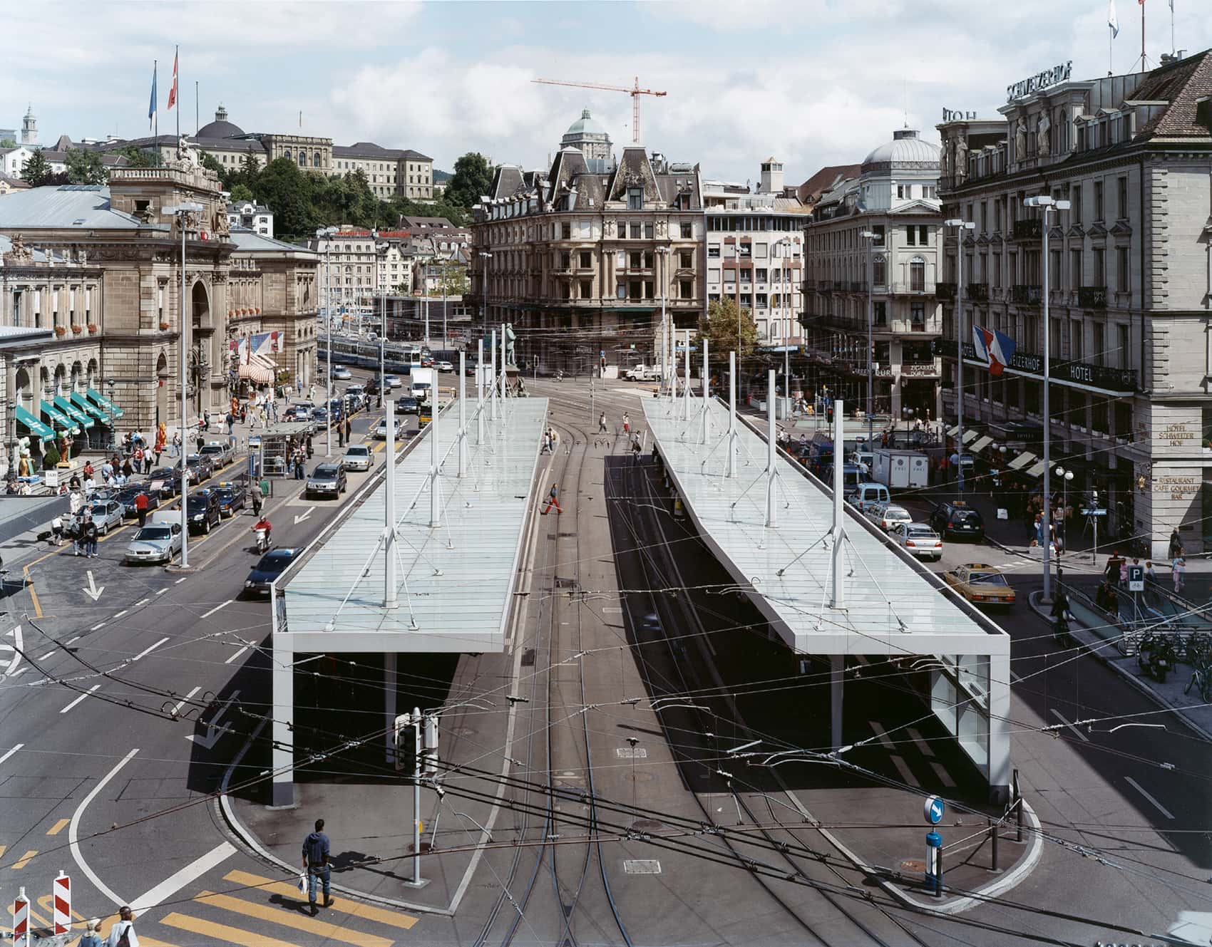 Die Tramwartehalle lässt sich in vier Teile differenzieren: Sockel, Wand, Dach und Pylone. In erster Linie dienen diese Elemente als Wetterschutz für die VBZ-Kundinnen und ‑Kunden. Die Rückwand schirmt ausserdem gegen den Lärm und Schmutz der vorbeifahrenden Autos und Busse ab. Die hinterleuchtete kastenförmige Rückwand wird punktuell mit Werbeplakaten bespielt.