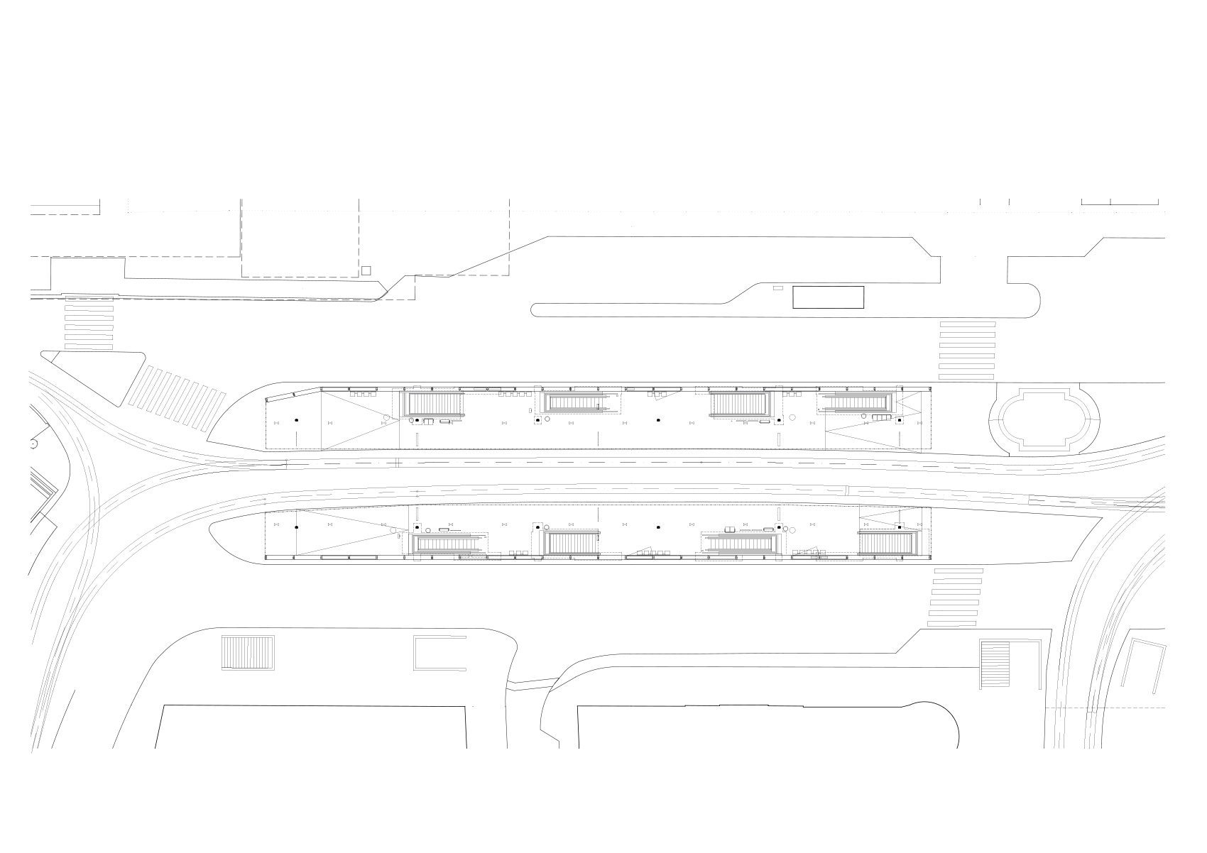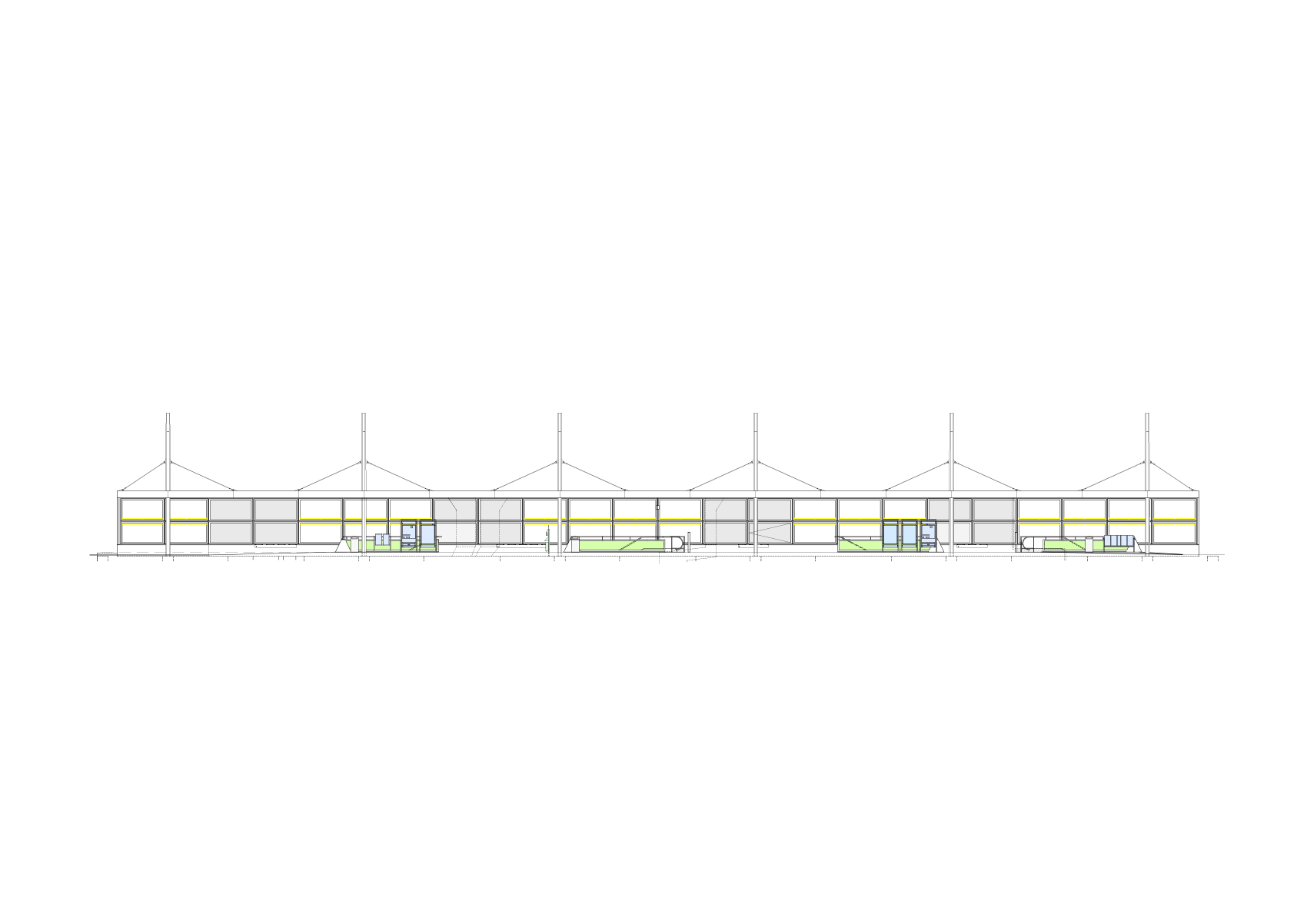 Der Sockel bildet das statische Fundament der Wand und schützt vor seitlichen Aufprallkräften bei Unfällen mit Fahrzeugen. Die Wand besteht aus quadratischen Hohlprofilstützen aus Stahl und den dazwischen liegenden Leuchtkästen aus Aluminium. Darin werden die Elektroleitung, die Lüftung des Shopville sowie die Dachentwässerung unsichtbar geführt. Das Dach setzt sích aus einem Stahlfachwerk mit Kunststoffabdeckung sowie einer Dachuntersicht aus lichtdurchlässigem Streckmetall zusammen. Die bestehenden Pylone werden erhalten. Die Anschlusspunkte des Daches werden entfernt und geschlossen, das neue Dach wird an der höheren Position angeschlossen, die Anschlüsse der Abspannungen werden entsprechend nach oben versetzt.