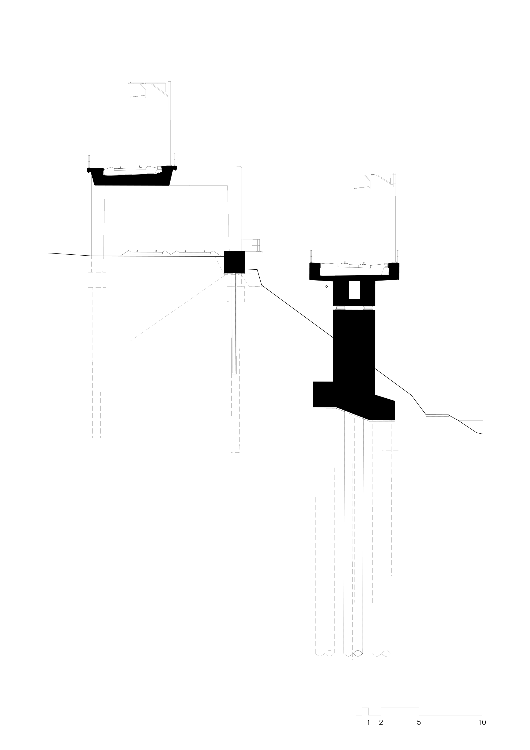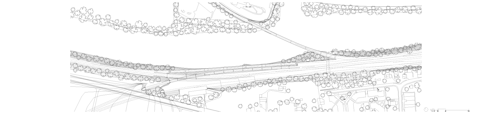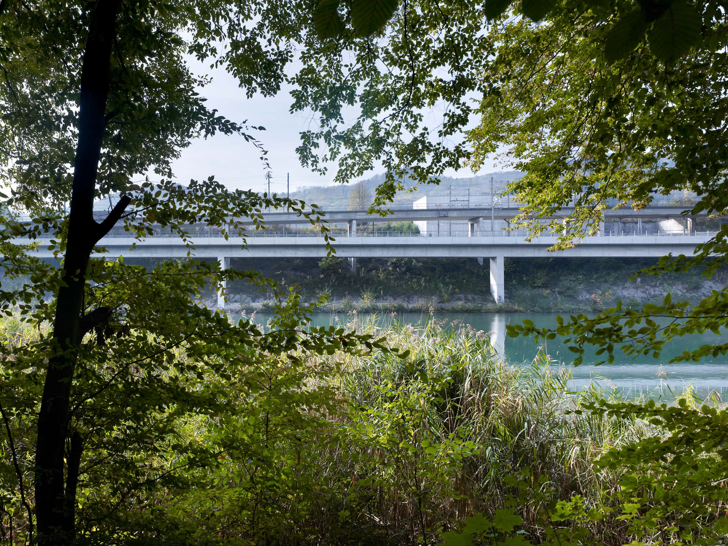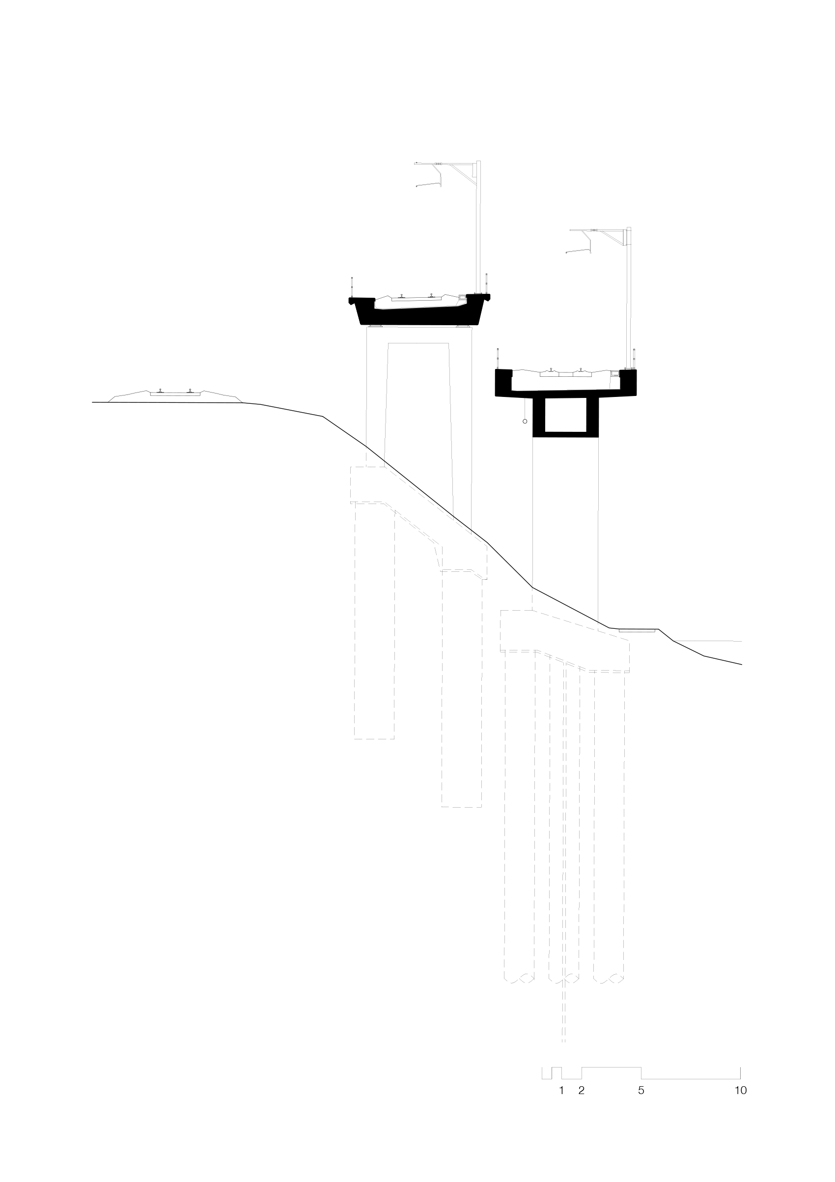 Der Neubau soll so künstlich und abstrakt wie möglich im Flussraum und im Hang in Erscheinung treten. Ein durchgehendes, horizontal gegliedertes Band mit grossen Spannweiten löst sich vom Hang, wird zum Brückenbalken und liegt als Band wieder auf der Böschung. Das Band besteht in der vertikalen Reihung aus Stützmauer, Brücke, Stützmauer und in der horizontalen Schichtung aus Kasten und Platte.