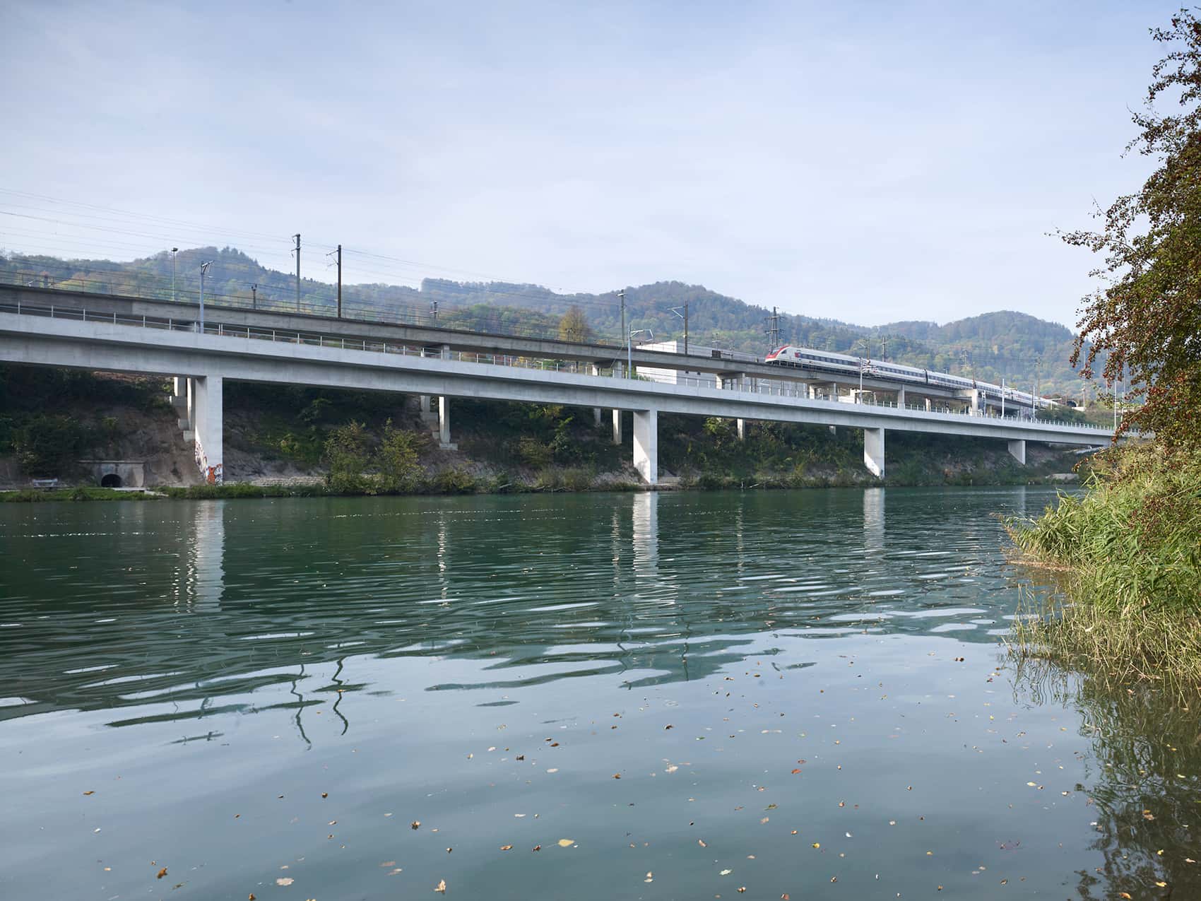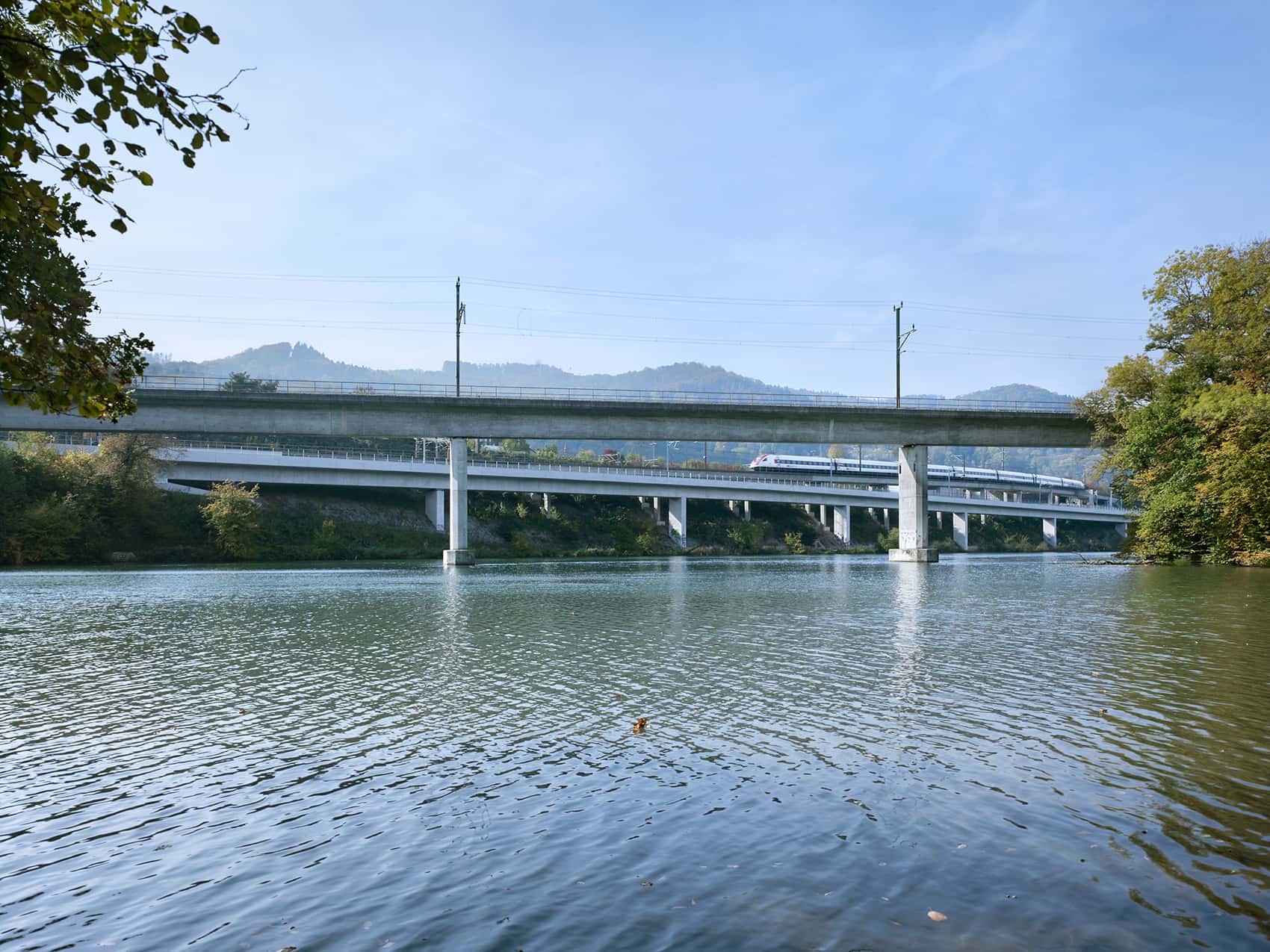 Der bestehende Viadukt der Heitersberglinie und die Brücke über die Limmat geben die Rahmenbedingungen für den neuen Viadukt vor. Der Viadukt hat Spannweiten von 25 Metern. Die Stützen des Neubaus werden im gleichen Rhythmus gestellt, allerdings mit Spannweiten von 50 Metern. Gestalterisch ist eine Unterscheidung erwünscht. Der Hang und der Uferweg sollen mit möglichst wenig Stützen tangiert werden, der neue Viadukt wirkt kräftig und dynamisch.