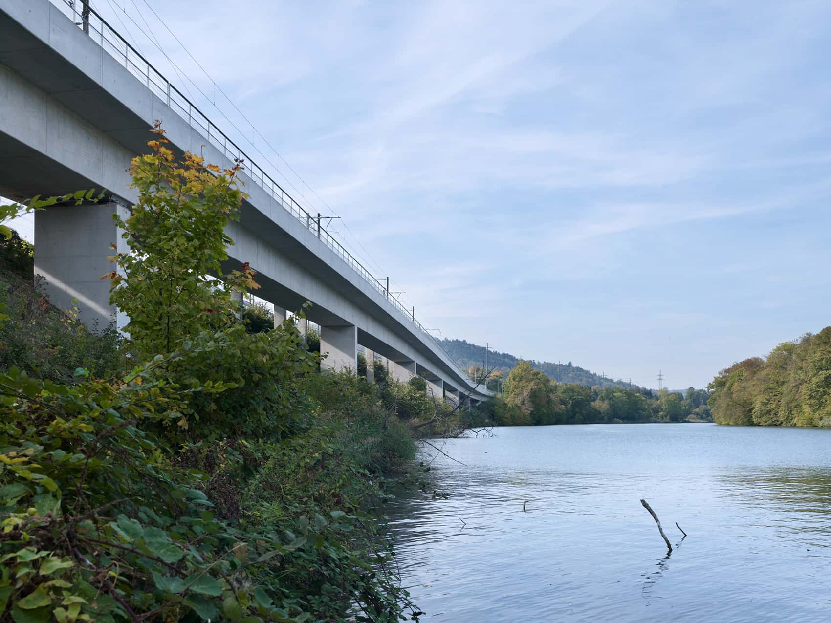 Das durchlaufende Profil wirkt über seine ganze Länge elegant und dynamisch und weist damit auf seine Funktion als Eisenbahnbrücke hin. Die Auflager sind nicht sichtbar, die zurückversetzten, im Schatten liegenden Stützen wirken abstrakt.