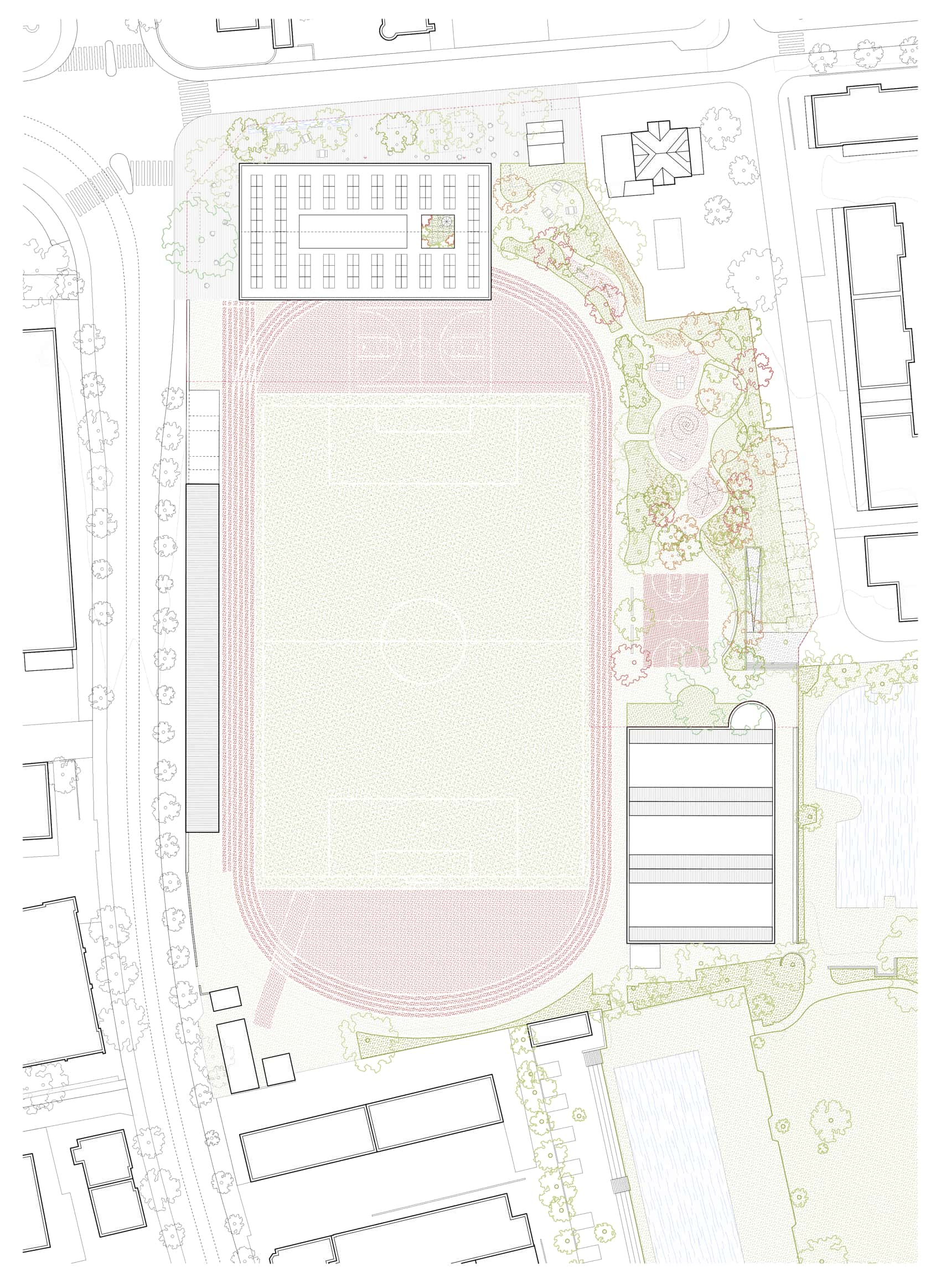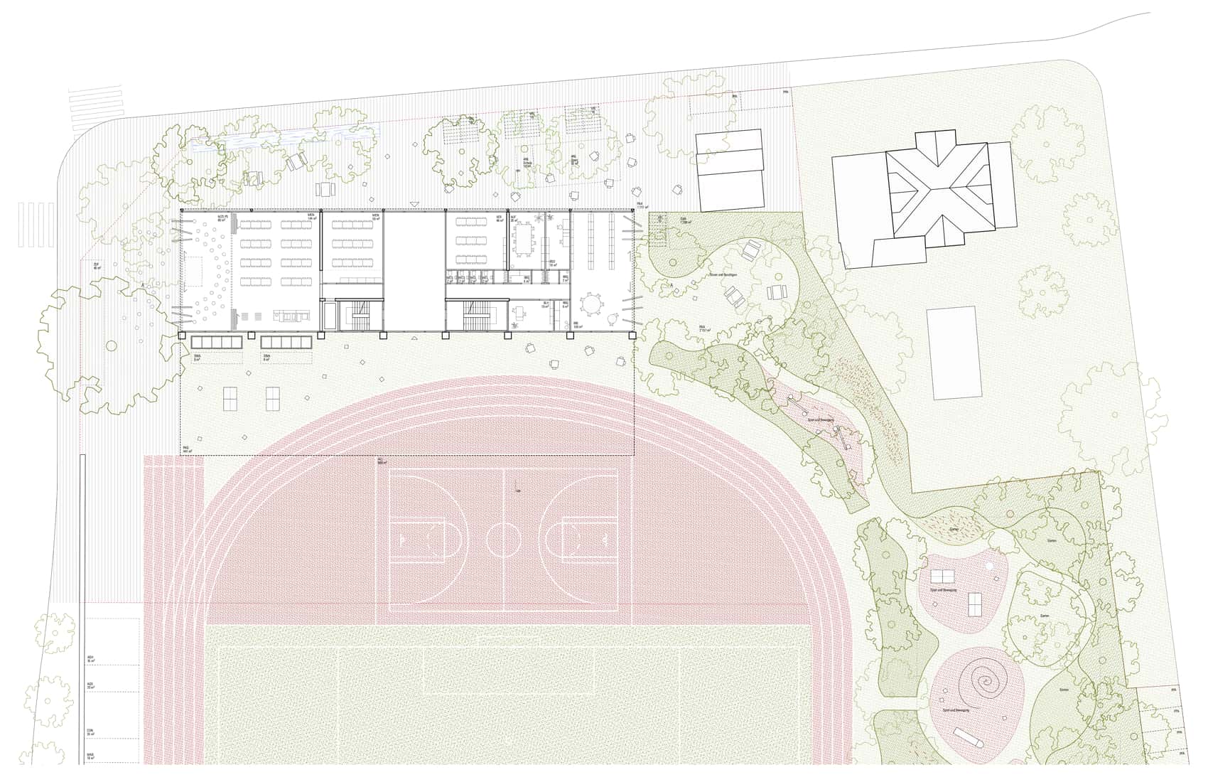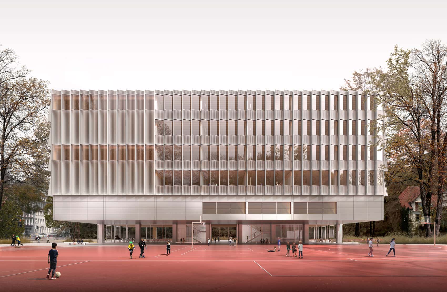Das Projekt reagiert mit radikaler Einfachheit auf die engen Platzverhältnisse und die einschränkende Lärmbelastung. Das kompakte Bauvolumen kragt über die Rennbahn aus und schafft einen einzigartigen, gedeckten Aussenraum. Zwei Sporthallen schützen die 18 Klassenzimmer von der Lärmemissionen, das öffentliche Erdgeschoss ist sowohl für die Schule als auch für das Quartier permeabel und zugänglich.