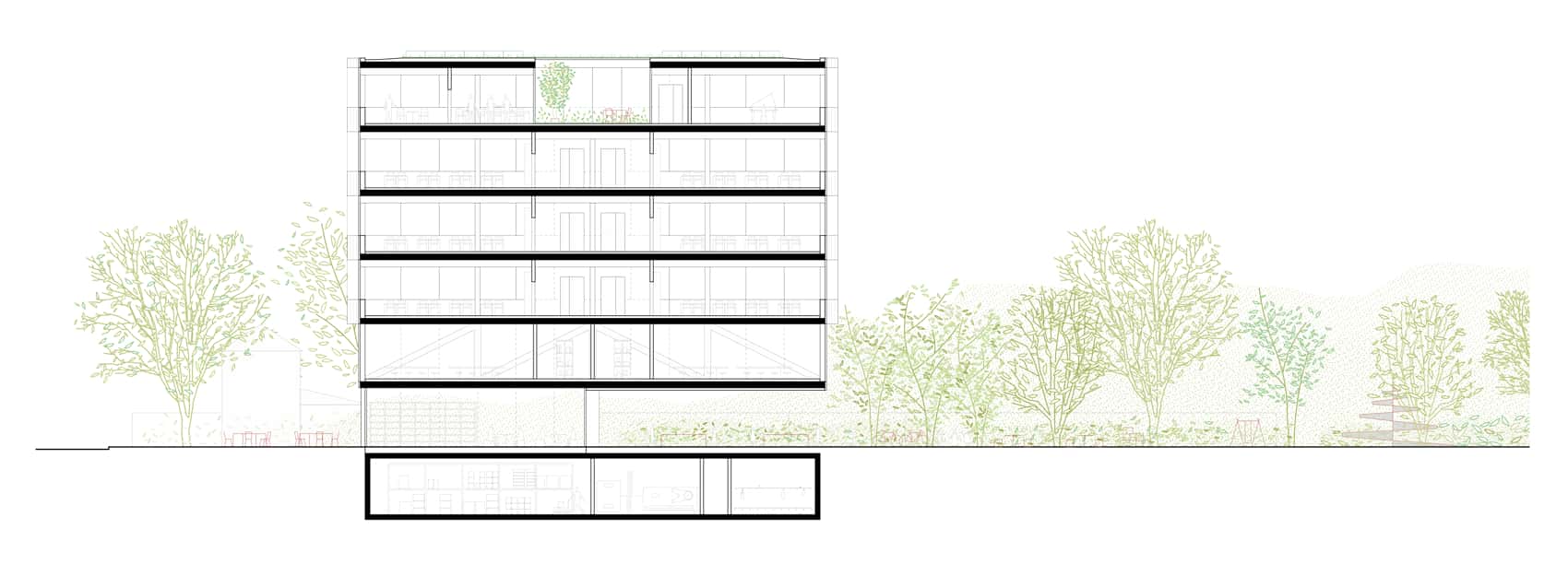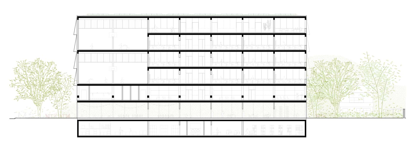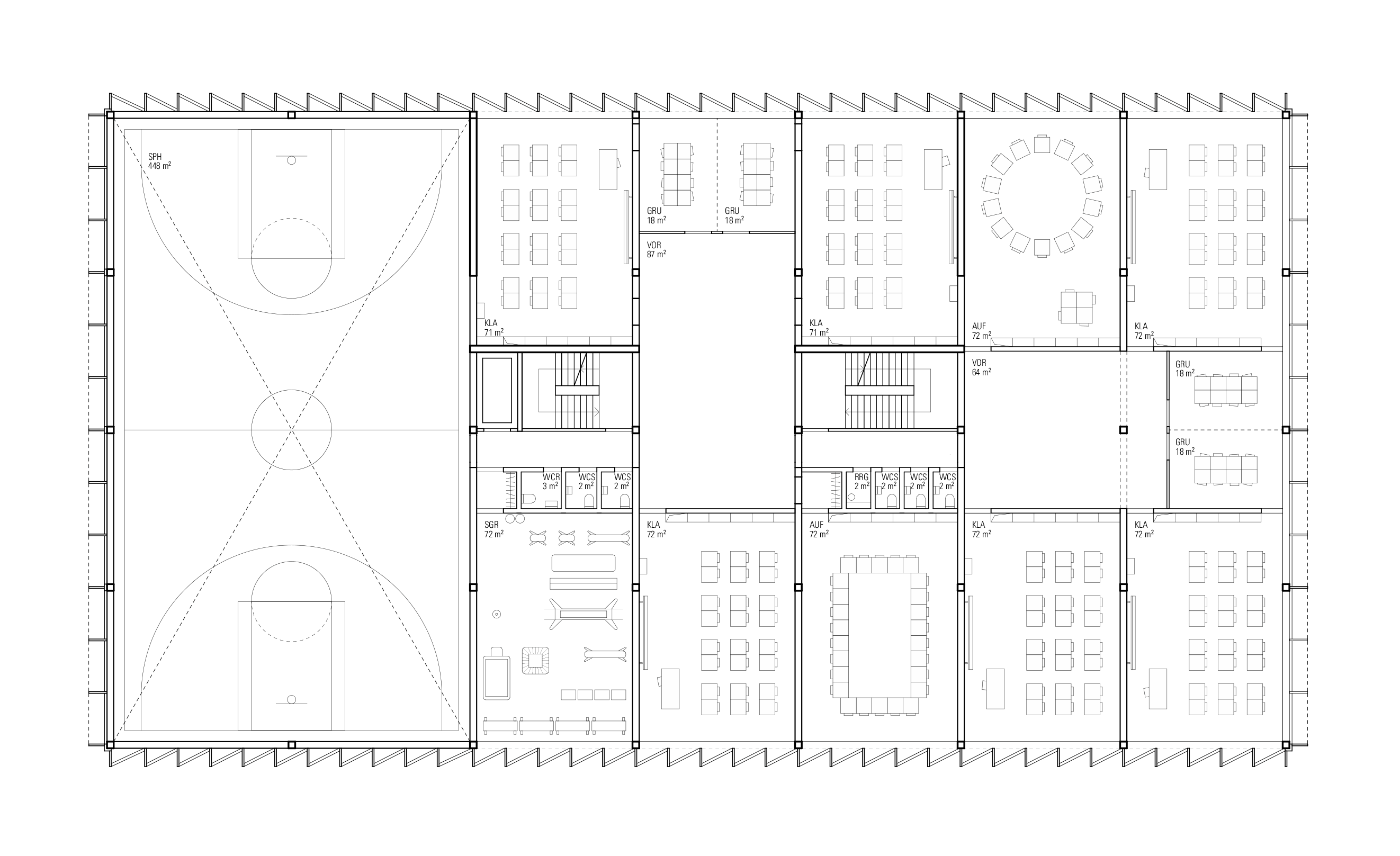 Das Projekt reagiert mit radikaler Einfachheit auf die engen Platzverhältnisse und die einschränkende Lärmbelastung. Das kompakte Bauvolumen kragt über die Rennbahn aus und schafft einen einzigartigen, gedeckten Aussenraum. Zwei Sporthallen schützen die 18 Klassenzimmer von der Lärmemissionen, das öffentliche Erdgeschoss ist sowohl für die Schule als auch für das Quartier permeabel und zugänglich.