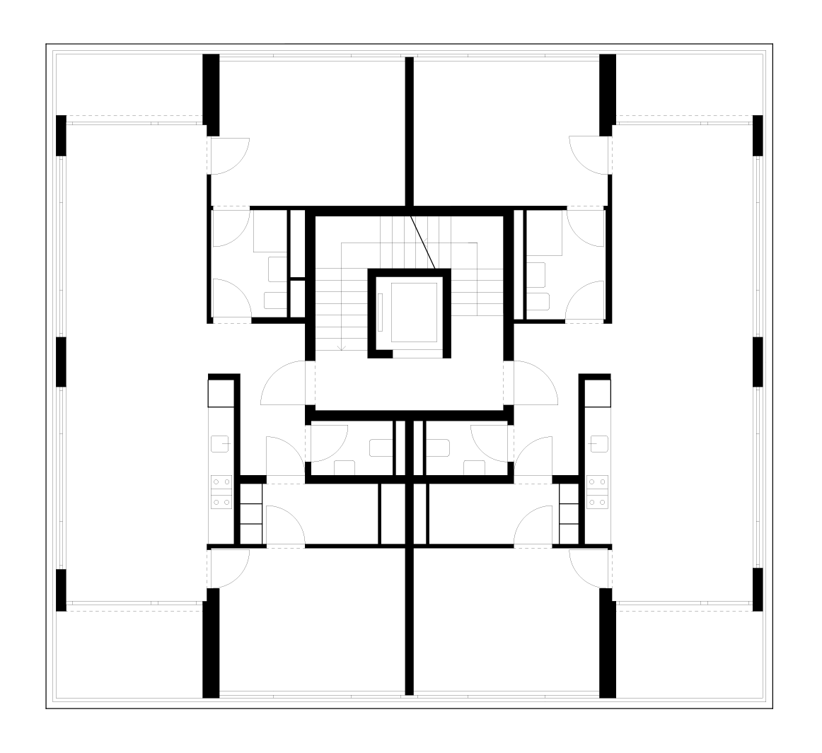 The apartments are organised in plan around a central circulation core. The garden-level and attic apartments each occupy an entire floor, with living spaces opening generously to the south. On the standard floors, two apartments are arranged per level: the bedrooms are positioned around the core, while the living spaces are arranged peripherally and open to both the east and the west.