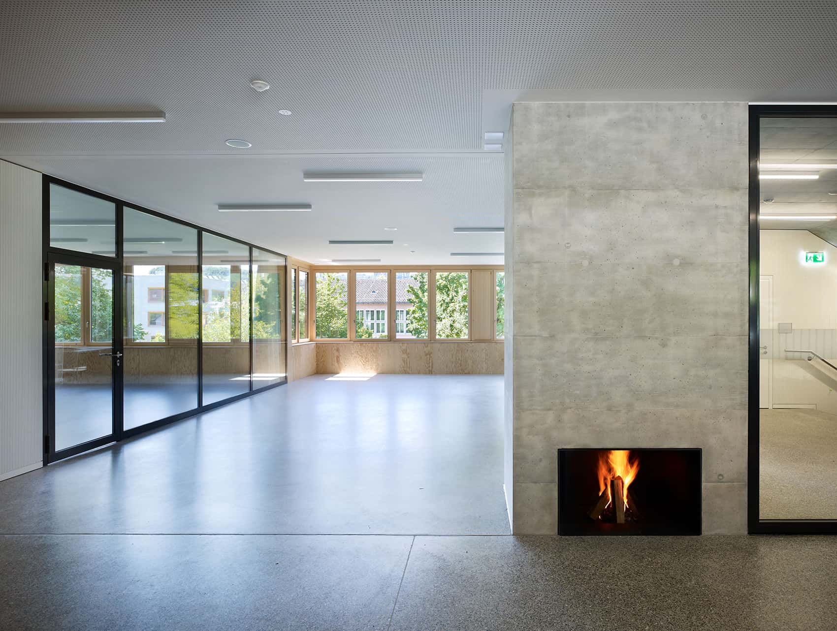 At the heart of the school are four flexible learning areas. They extend classrooms, provide space for social interaction, or serve as interior break rooms. A fireplace in the first-floor learning area forms the symbolic center of the school, reinforcing the sense of community between children and teachers and creating a homely atmosphere that transcends the purely functional.