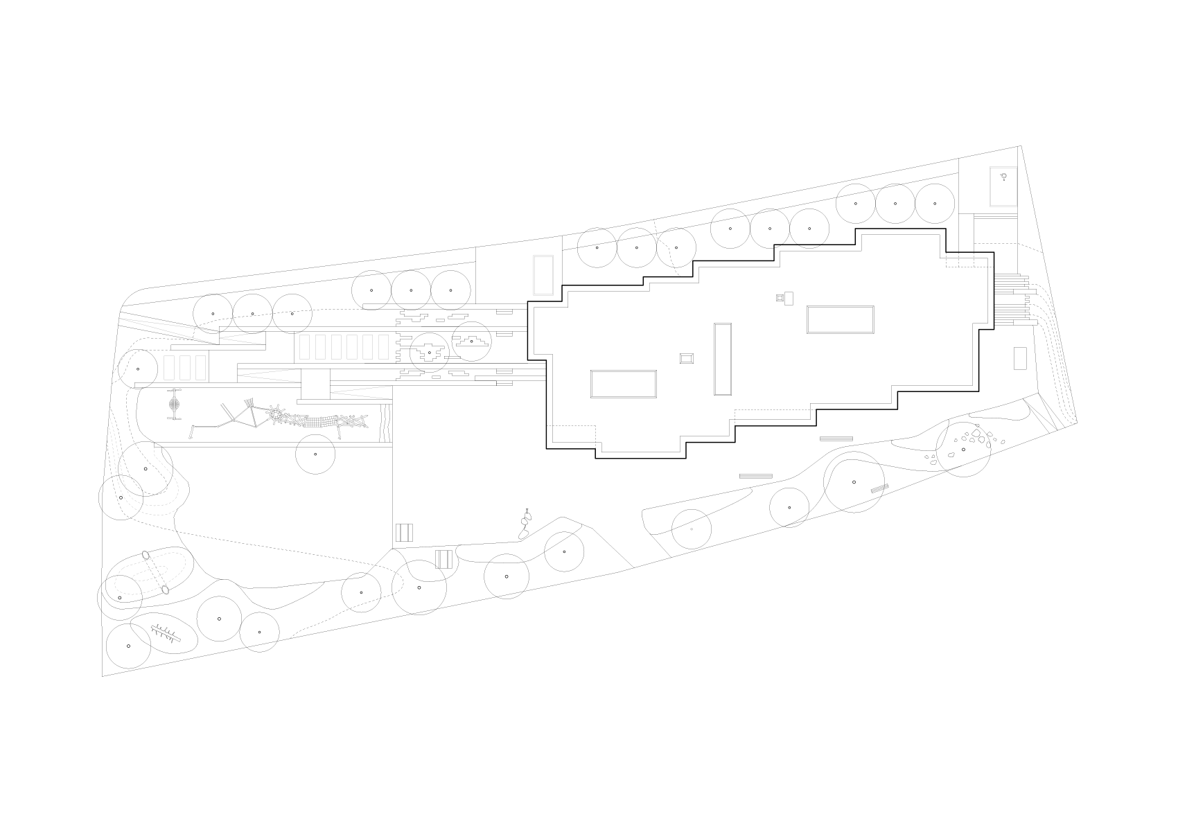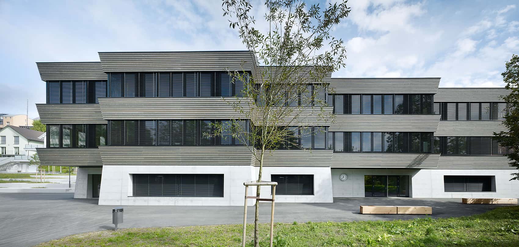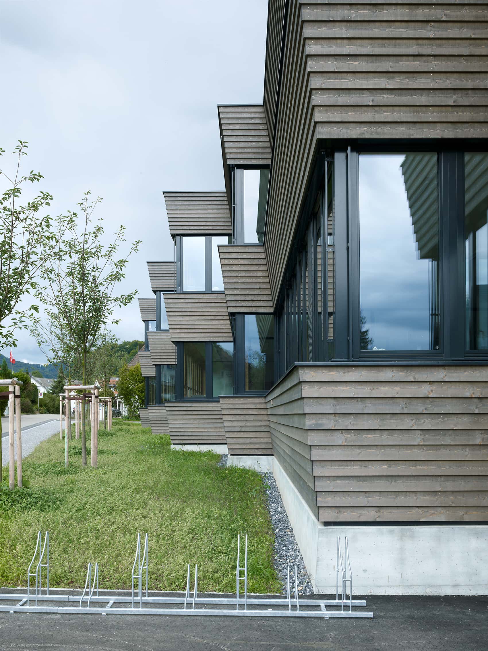 Responding to topography and program, the building is organized into a base level and two upper floors. Continuous window bands blur the boundary between inside and outside, giving the structure a clear horizontal expression. The concrete plinth, thickening as it meets the ground, balances the cantilevered wooden cladding above. Entrances are accentuated by setbacks and projecting volumes, while skylights and chimneys animate the flat roof into a sculptural roofscape.