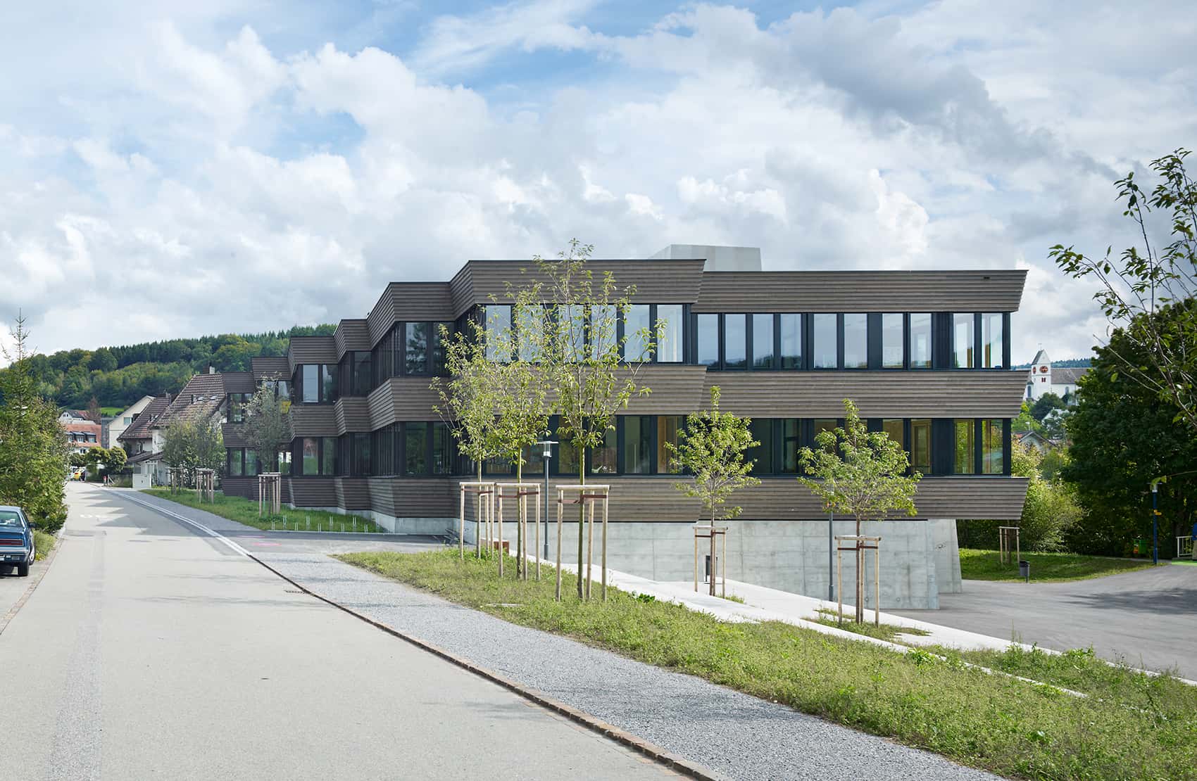 Set in the northeastern corner of the plot, the building takes advantage of the natural slope to form a plinth. Here, the main entrance opens towards the existing school campus, while the schoolyard is placed to the west. Designed for future expansion, the yard is intended to become the center of the Haldenacher schools. Public paths flow around the volume and connect it seamlessly to the surrounding network of streets and trails.