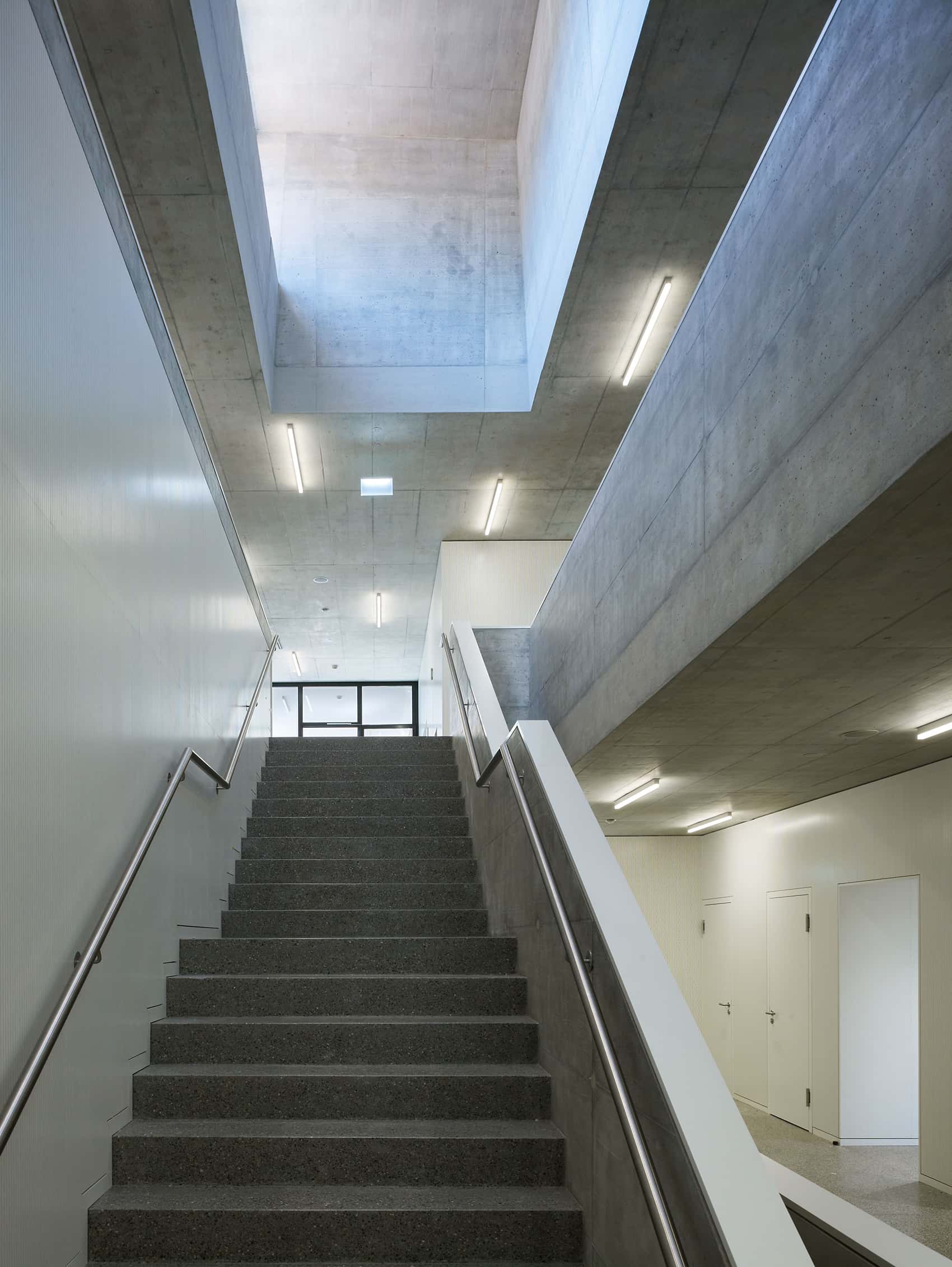 The program separates into two parts: classrooms and the multipurpose hall on the upper floors; teachers’, therapy, and music rooms on the ground floor. An additional southeast entrance provides independent access to these rooms outside school hours, while deliveries arrive from Haldenacher Street.
