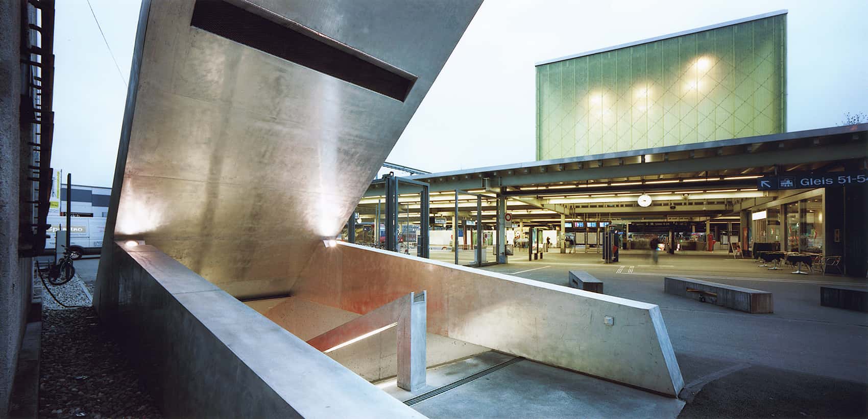 The bike station is located in the existing basement of the partially listed Sihlpost building. Owing to the strict requirements of heritage conservation, fire protection authorities, and the UGZ, as well as tight budget constraints, the architectural concept focuses on enhancing orientation through color and light. The canopy, serving both as a distinctive marker and as weather protection for the stairway with bicycle ramps, makes the facility intuitively identifiable. It consists of a steel structure clad in metal, with the air intake and lighting seamlessly integrated.