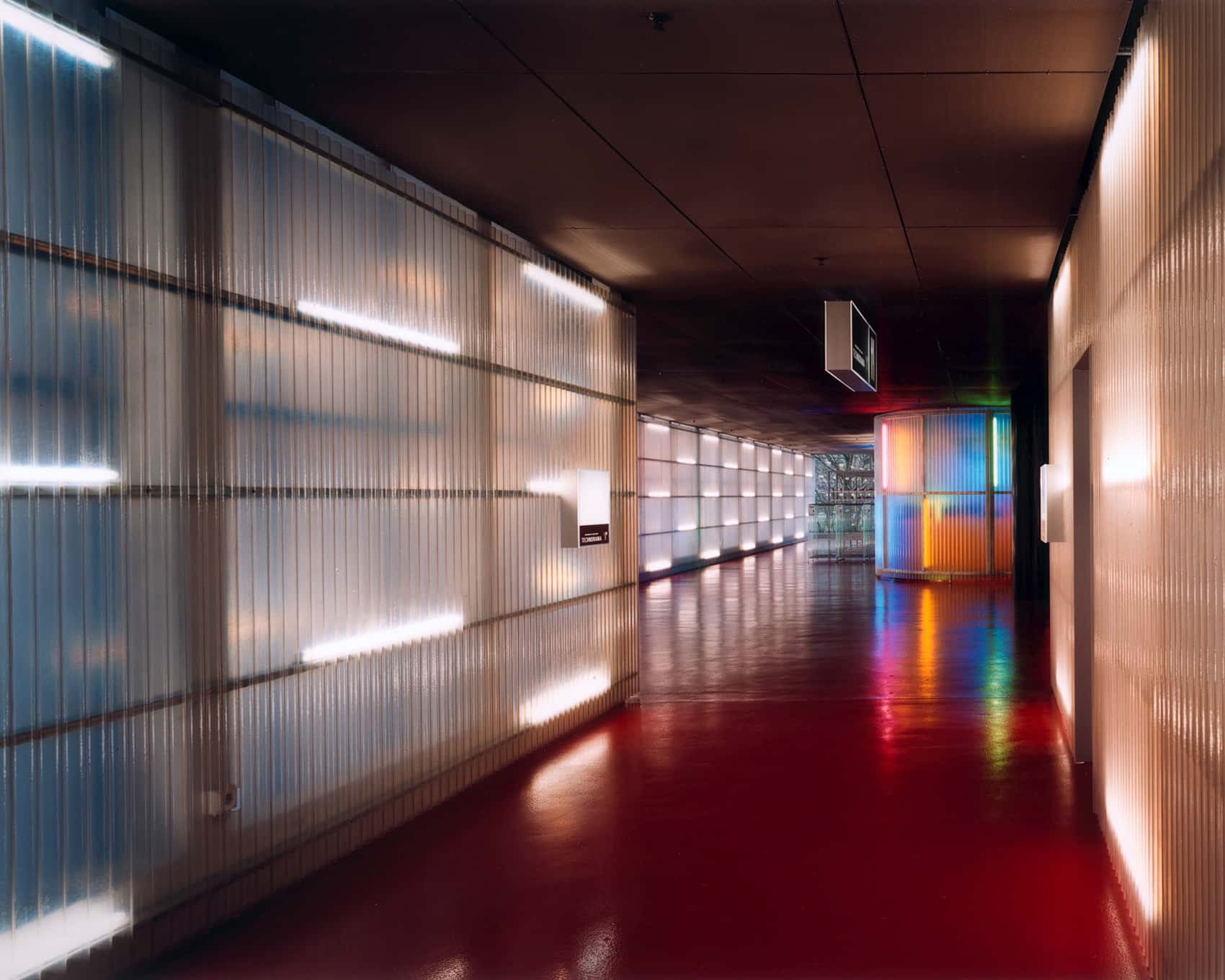 Dieser Raum-Kanal, der mit einem leuchtend roten Boden aus Epoxidharz versehen ist, verbindet den Vorplatz der Eingangszone mit dem rückseitigen Ausgang in den Park und ist gleichzeitig Eingang, Foyer, Erholungszone, Kommunikationsort und Treffpunkt. Als ‘roter Teppich’ ist er heiterer Willkommensgruss für den Besucher und Orientierungshilfe im Gebäude. Der Raum-Kanal ‘schiesst’ an beiden Enden zeichenhaft aus dem Baukörper heraus; der Eintritt in den auch als Vordach dienenden Kanal erfolgt stufenweise: Nach aussen ist er mit einem Rolltor versehen, während ein zurückversetzter, seitlich aufrollbarer Industrievorhang zusammen mit einem Wärmevorhang als Windfang den eigentlichen Zutritt ins Gebäude gewährleistet. Der durchgehende rote Kanal, der mit einer grossflächigen Verglasung über den bestehenden Innenhof belichtet wird, bildet das attraktive neue Zentrum des Technorama, das sich in seiner Zeichenhaftigkeit von der bestehenden Architektur abhebt, diese aber nicht konkurrenziert. Die Materialisierung der neuen Teile ist an die zurückhaltende Architektur des bestehenden Gebäudes angelehnt: Die Fassaden des Raum-Kanals sind mit transluzenten Lichtwellplatten ver-kleidet und mit Fluoreszenz-Röhren hinterleuchtet.
