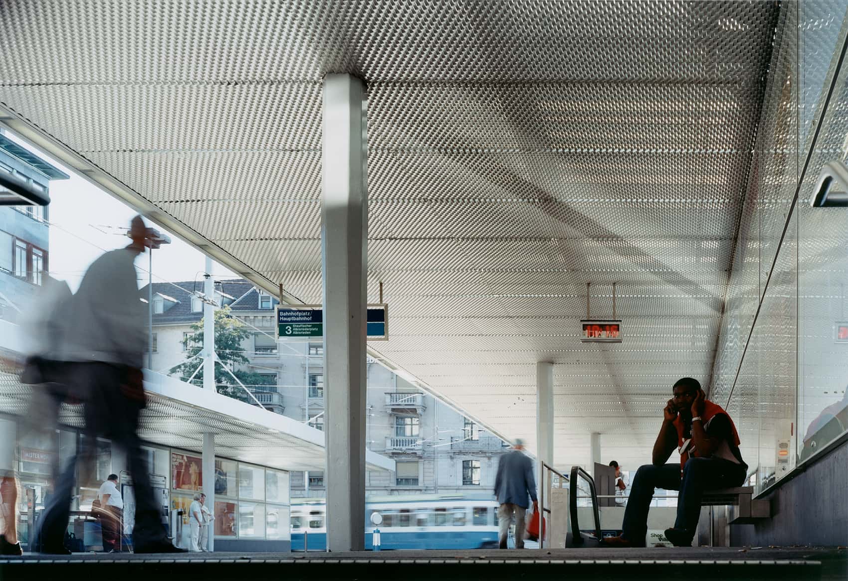 Die Tramwartehalle lässt sich in vier Teile differenzieren: Sockel, Wand, Dach und Pylone. In erster Linie dienen diese Elemente als Wetterschutz für die VBZ-Kundinnen und ‑Kunden. Die Rückwand schirmt ausserdem gegen den Lärm und Schmutz der vorbeifahrenden Autos und Busse ab. Die hinterleuchtete kastenförmige Rückwand wird punktuell mit Werbeplakaten bespielt.